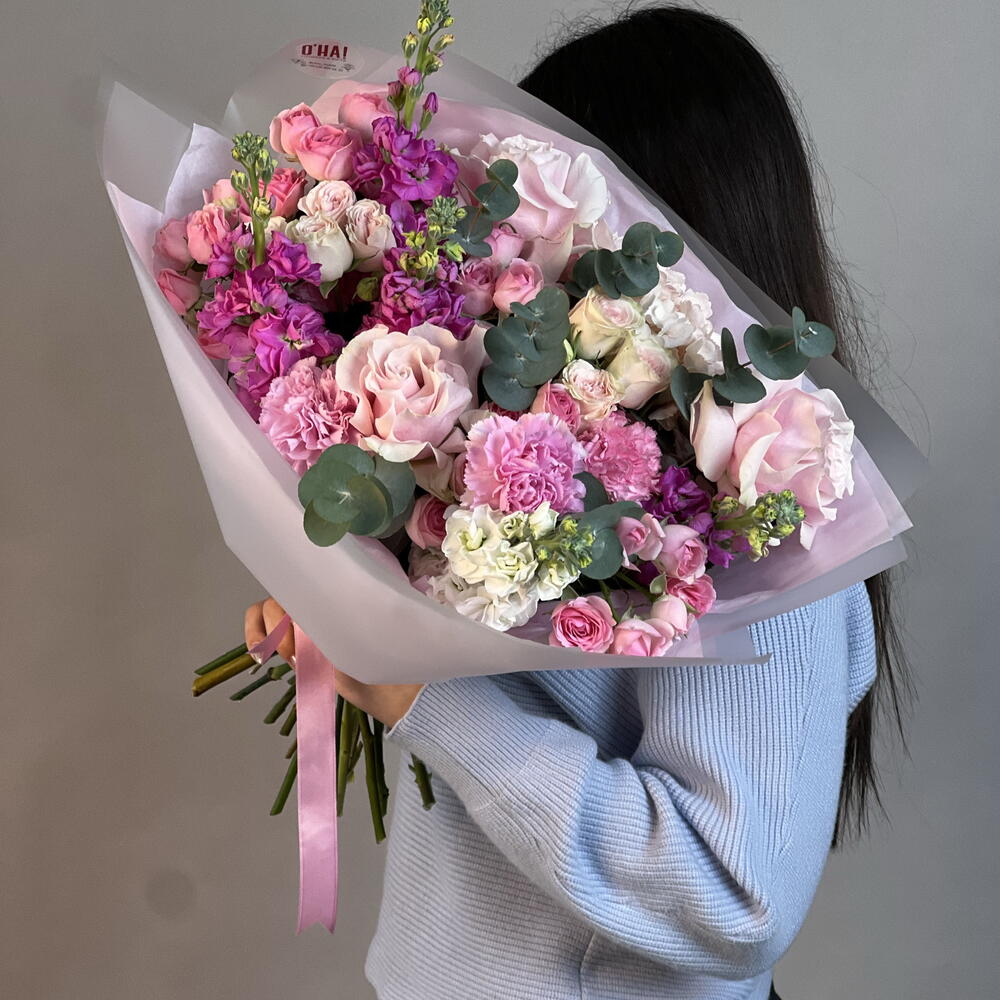 Spray rose - 7 шт. Hydrangea - 1 шт. Box - 1 шт. rose - 3 шт. dianthus - 4 шт. matthiola - 5 шт. euvcaliptus - 5 шт.