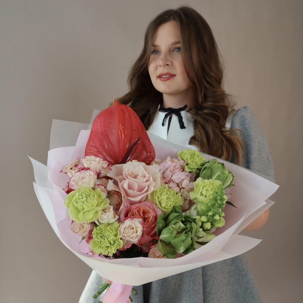 Snapdragon - 1 шт. Spray rose - 4 шт. Hydrangea - 1 шт. dianthus - 5 шт. anturium - 1 шт. pink expression - 1 шт. rose mondial - 1 шт. rose veggie - 2 шт.