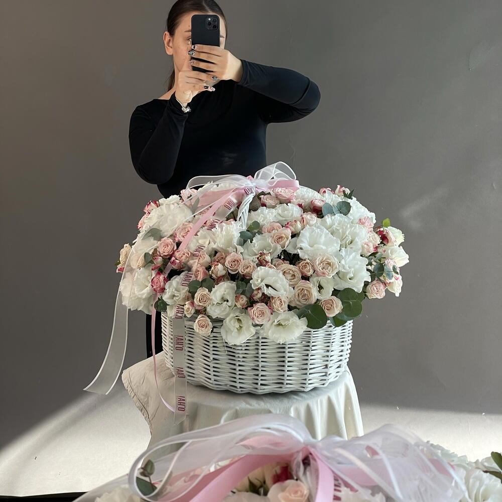Eustoma - 36 шт. Spray rose - 36 шт. Basket - 1 шт.