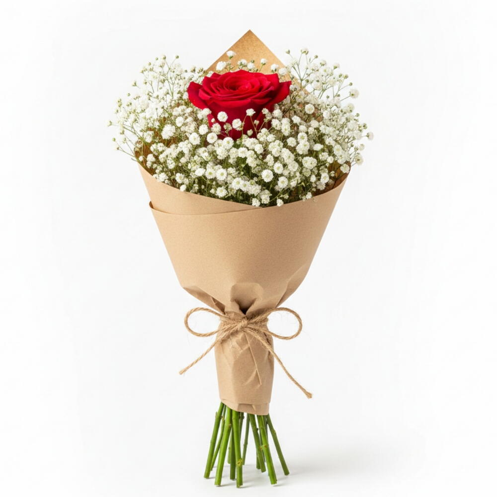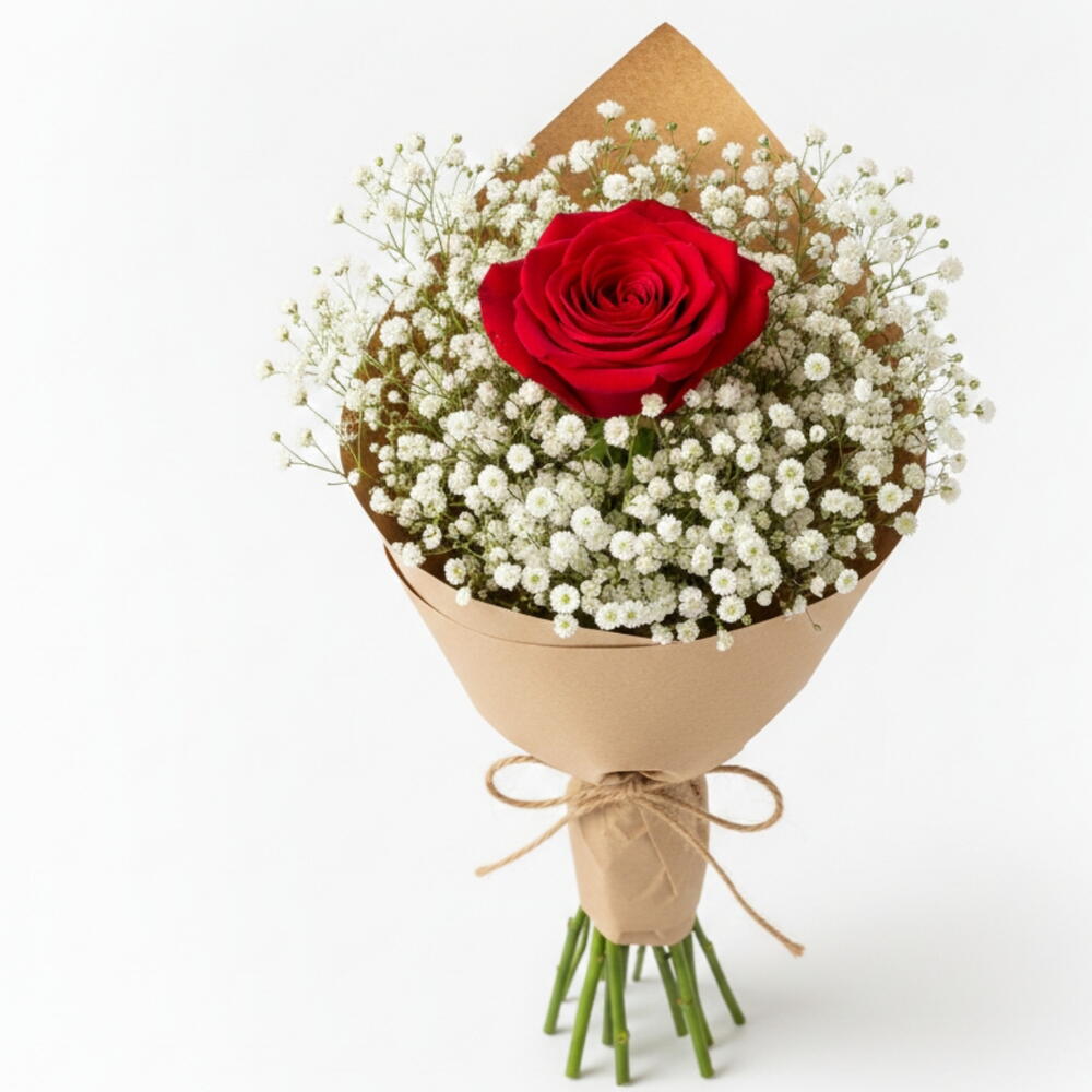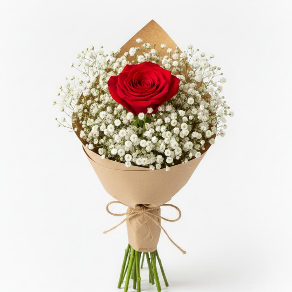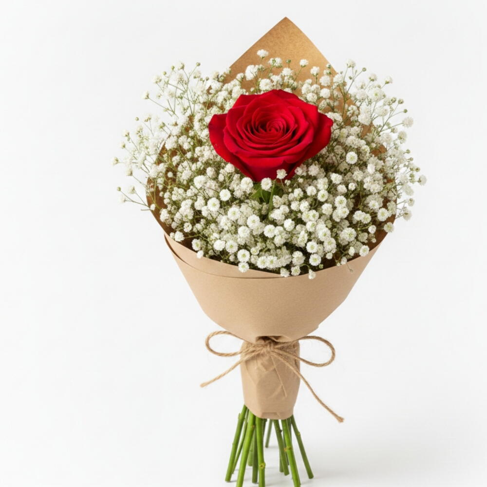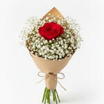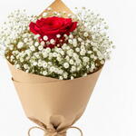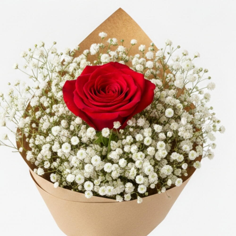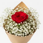 (Состоит из 1 красной розы и 30 г гипсофилы). Почему стоит выбрать этот букет? Доступная роскошь: Несмотря на низкую стоимость, букет выглядит довольно пышным и привлекательным благодаря большому объему, создаваемому гипсофилой. Вы потратите деньги не просто на цветы, а на ощущение грандиозного жеста. Глубокий смысл: Он элегантно передает вашей любимой послание «Ты моя единственная, моя самая драгоценная». Идеально подходит для первых свиданий, спонтанных сюрпризов или просто потому, что вам этого захотелось. Натуральный и модный: Благодаря минималистичной крафт-бумаге и обилию гипсофилы с натуральной текстурой, он идеально соответствует последним тенденциям. Быстрая доставка: Благодаря быстрой доставке на платформе Flowwow, вы можете мгновенно выразить свои чувства без задержек! Создайте счастье одним жестом! Основной цветок: 1 первоклассная живая красная роза (средней длины стебля) Наполнитель: Много свежей гипсофилы (свадебный букет) Упаковка: Высококачественная натуральная крафт-бумага Аксессуар: Декоративная атласная лента Размер: Примерно 45-55 см (выглядит пышным благодаря объемной гипсофиле) Содержимое: (1 живая красная роза, 25 г гипсофилы)... Отличный подарок, который заставит кого-то почувствовать себя любимым в особые дни, такие как Международный женский день, День святого Валентина, День матери.