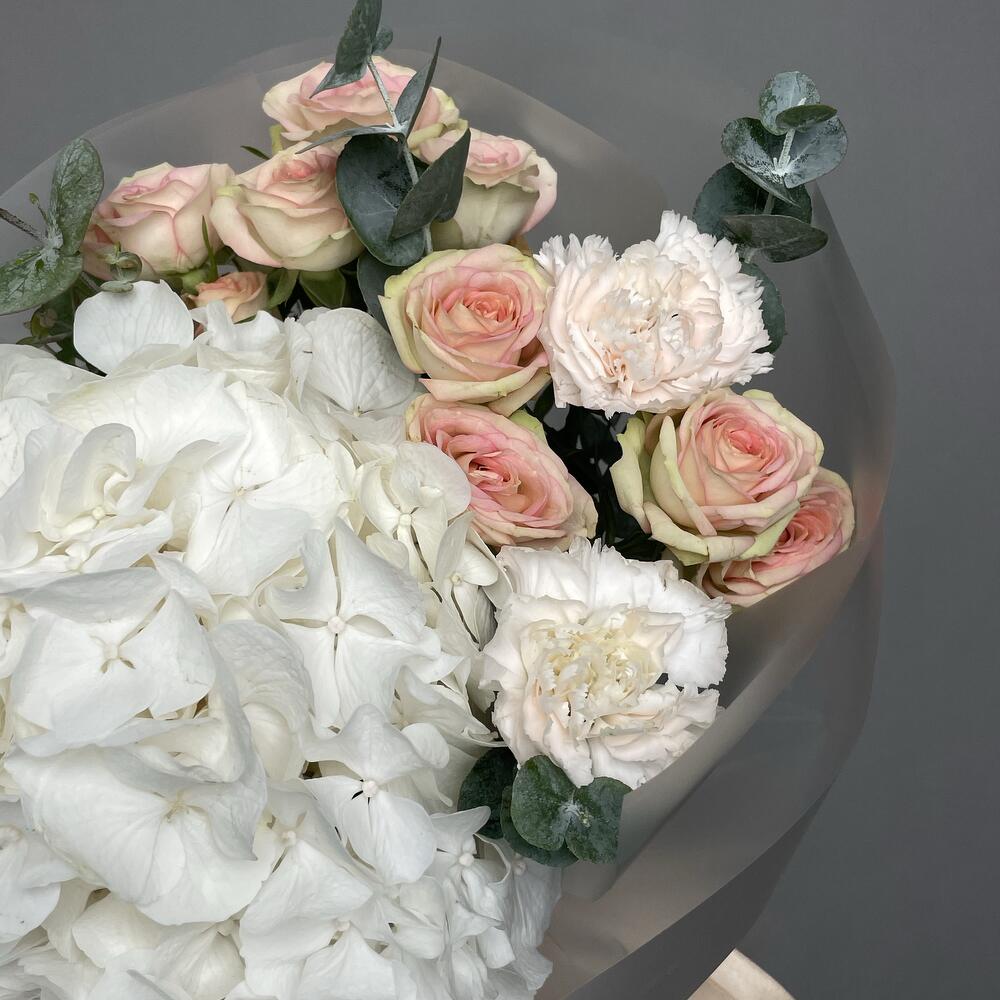 Spray rose - 2 шт. dianthus - 2 шт. hydrangea white - 1 шт. evcaliptus - 1 шт.