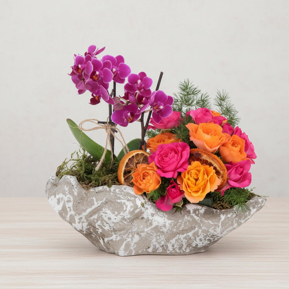 Этот изящный декоративный набор цветов, состоящий из эффектных миниатюрных фиолетовых орхидей и ярких оранжевых и розовых плетистых роз, представленных в каменном кашпо в форме лодочки, придаёт вашему дому или офису превосходный штрих. Благодаря элегантному дизайну и ярким цветам этот набор привносит в любое пространство утончённую и живую атмосферу. Также отлично подходит в качестве стильного подарка.