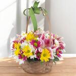 композиция с разноцветными цветами в корзине