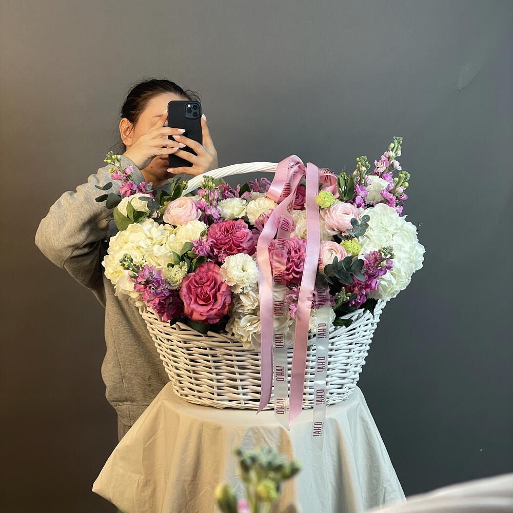 Гортензия - 5 шт. Маттиола - 8 шт. Эвкалипт - 1 шт. Эустома - 8 шт. Корзина плетеная - 1 шт. Нерина - 3 шт. роза контри блю пионовидная - 7 шт. Ранункулус - 3 шт.