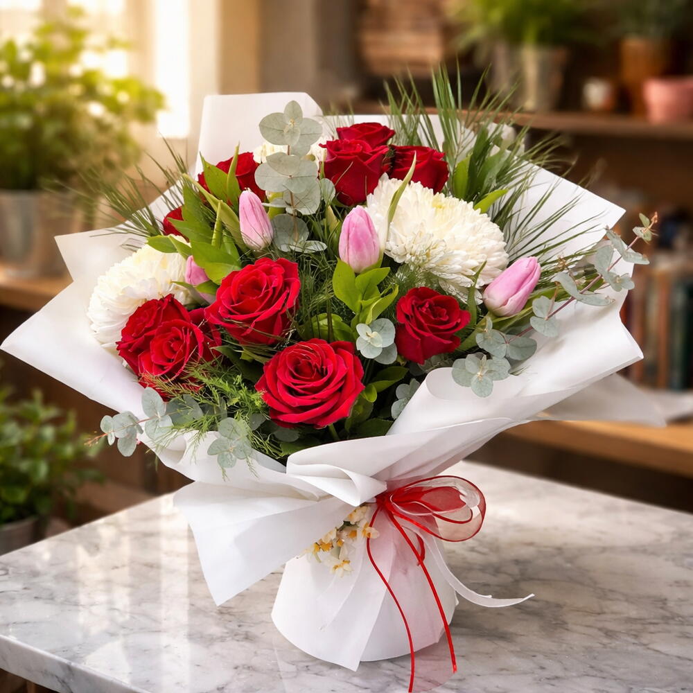 Этот эффектный букет цветов создаёт завораживающую комбинацию из 10 роз, 4 розовых тюльпанов, 2 Anastasia Blanca и 5 эвкалиптов, которые вместе образуют великолепную гармонию. Поданный в изящном и стильном сосуде, этот букет добавит вашему помещению особый штрих — как визуальное удовольствие, так и впечатляющий аромат. Идеальный выбор и чтобы побаловать близких, и чтобы отпраздновать особые моменты.
