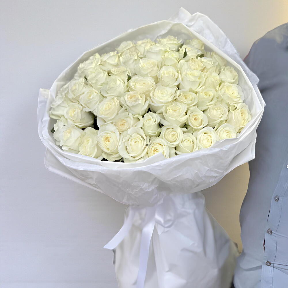 Этот великолепный букет цветов составлен из 81 изящной белой розы. И своим шиком, и своим смыслом эти белые розы делают любой ваш особенный момент наполненным и незабываемым. Подарите их любимым или украсьте ими дом — этот букет белых роз будет прекрасным выбором в любом случае.