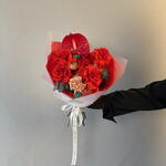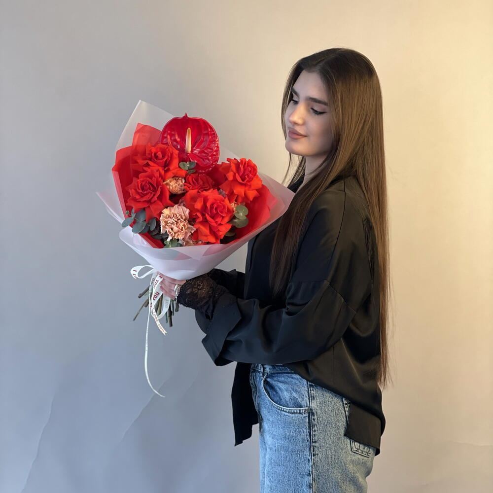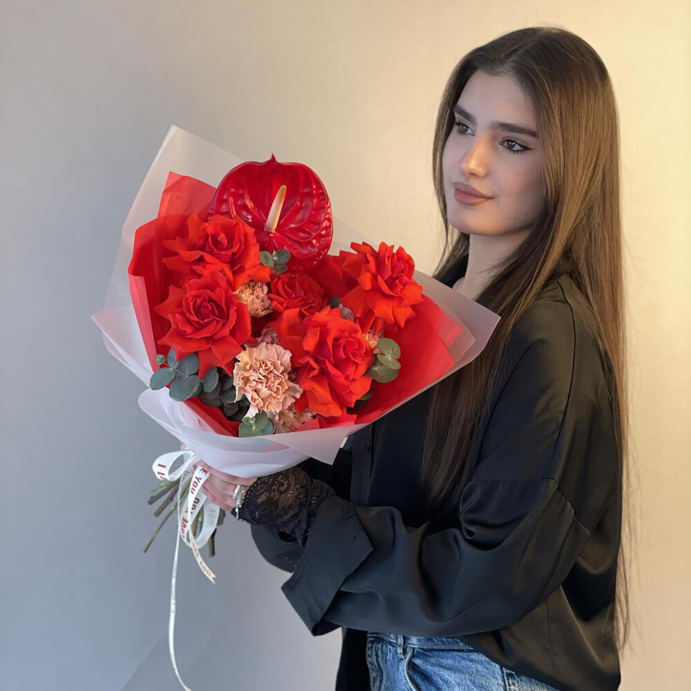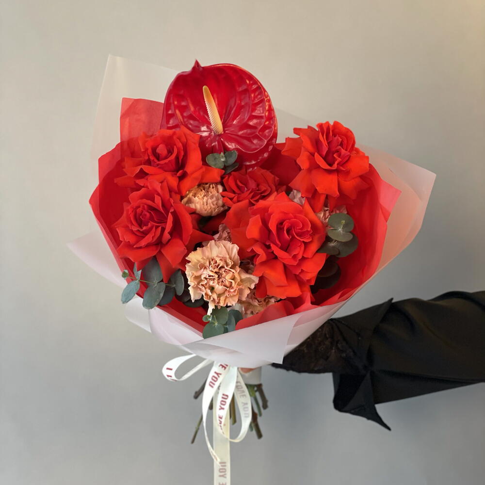 Anthurium - 1 шт. dıanthus - 5 шт. euvcaliptus - 1 шт. roses nina red - 5 шт. boks - 1 шт.