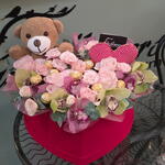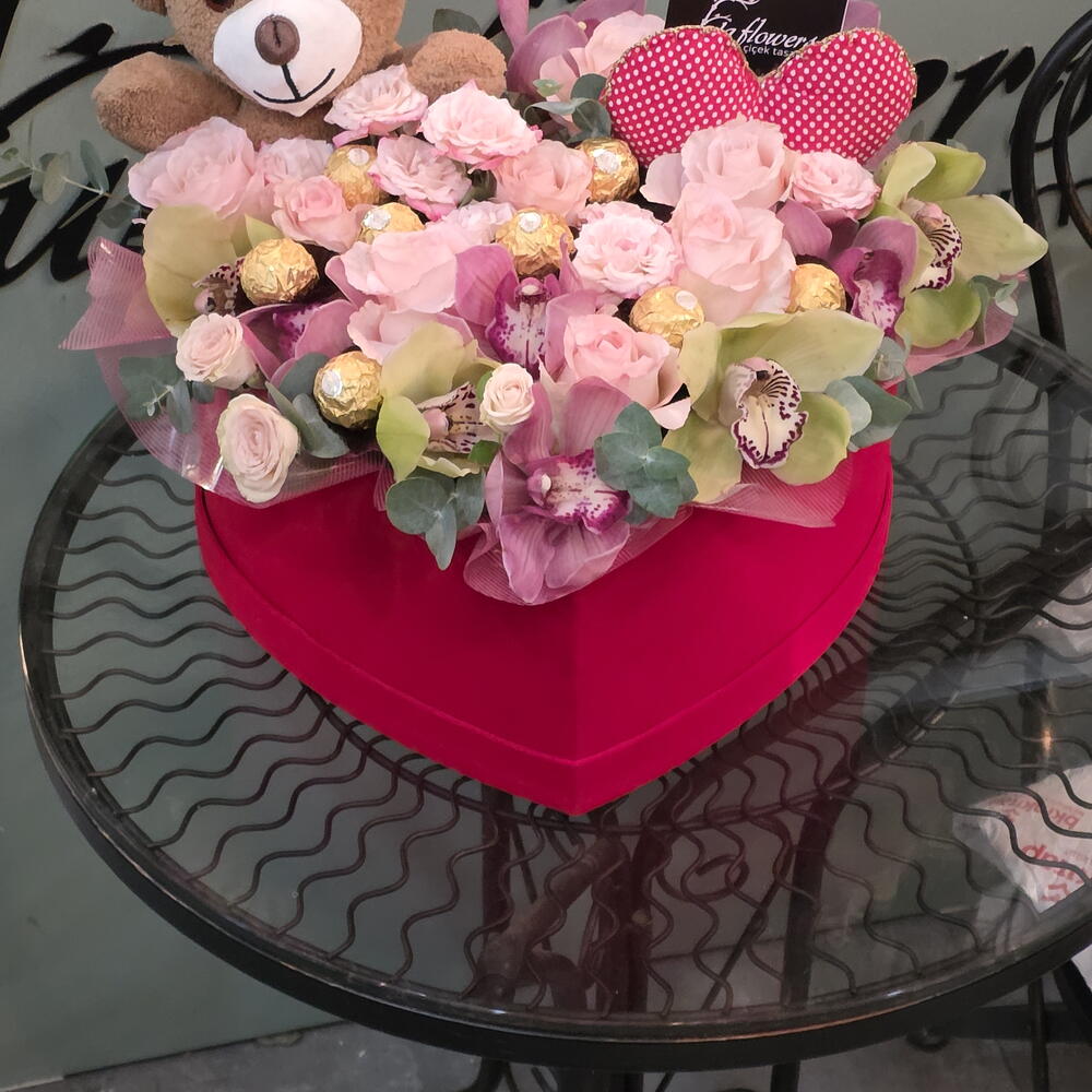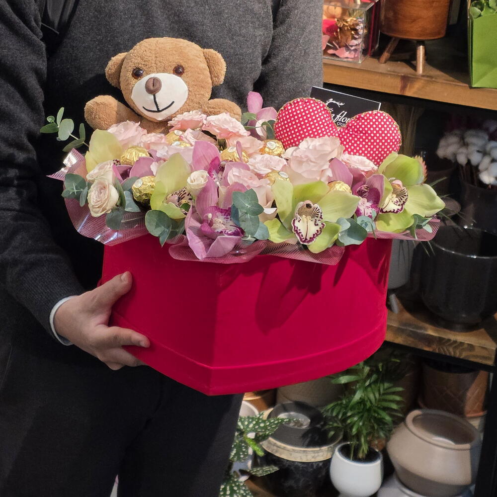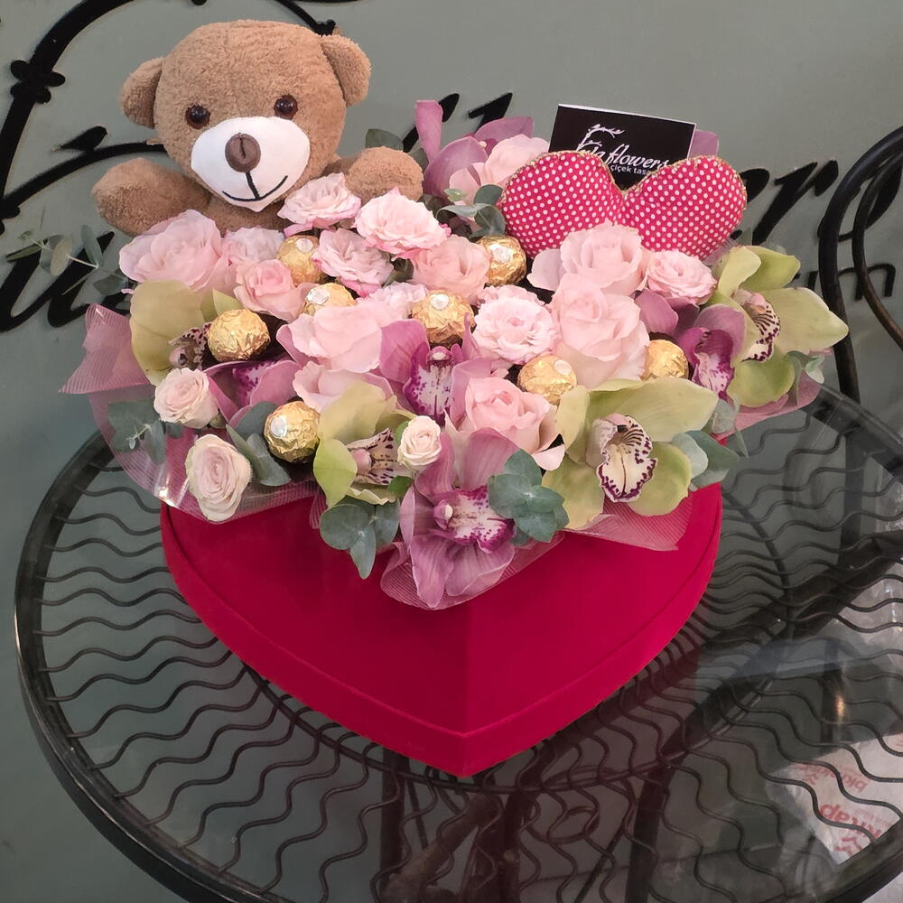 ferrero rocher chocolates - 8 шт. cymbidium orchids - 9 шт. букет роз в брызгах - 5 шт. pink roses - 9 шт. сердечная коробка - 1 шт. плюшевый мишка - 1 шт. ветки эвкалипта - 9 шт. плюшевое сердце - 1 шт.