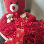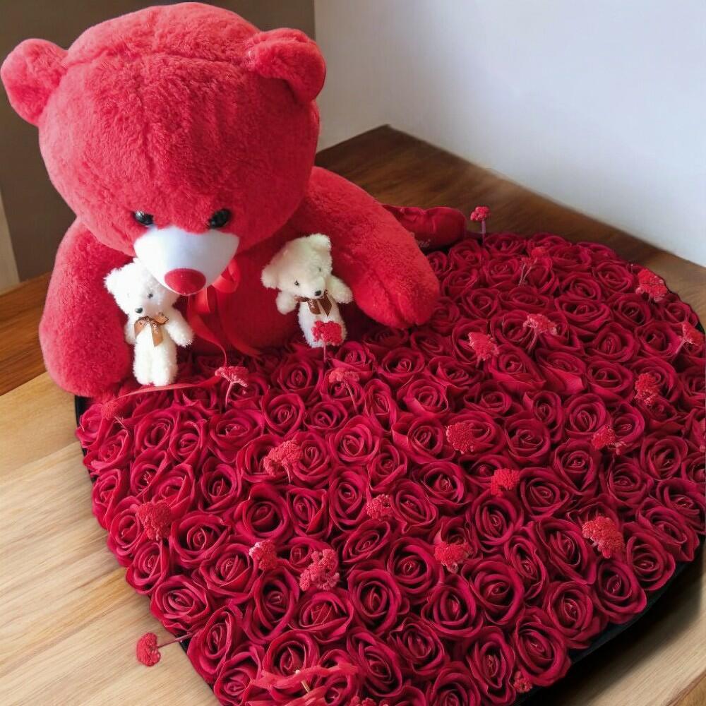 Этот набор включает 101 красную розу — символ романтики и любви, милого мини-плюшевого медвежонка (1 шт.), который согреет ваше сердце, и плюшевого медвежонка высотой 50 см (1 шт.), привлекающего внимание своими впечатляющими размерами. Кроме того, композицию внутри коробки обогащают 30 креативных сухих цветов различных цветов и видов. Цветы в этой коробке — один из самых изящных и необычных способов выразить свою глубокую любовь и признательность близким.