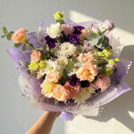 Этот элегантный смешанный букет состоит из 5 живых цветков хризантемы, 15 изящных цветков лизиантуса и 5 веток эвкалипта, создавая стильный дизайн. Букет создает романтическую атмосферу благодаря сочетанию цветов в мягких тонах, а ветки эвкалипта добавляют ему натуральности и свежего прикосновения. Эта комбинация будет идеальным выбором для любого особенного случая. Рекомендации по уходу: Регулярно поливайте ваше смешанное цветочное аранжирование водой, но будьте осторожны, чтобы избежать застоя воды. Чтобы сохранить хризантемы и лизиантусы свежими, меняйте воду каждые 2-3 дня, это поможет букету дольше оставаться живым. Также, держите букет подальше от прямых солнечных лучей, чтобы предотвратить увядание цветов.