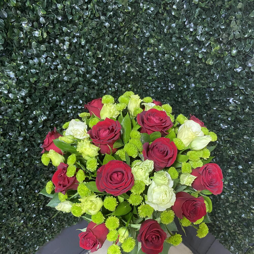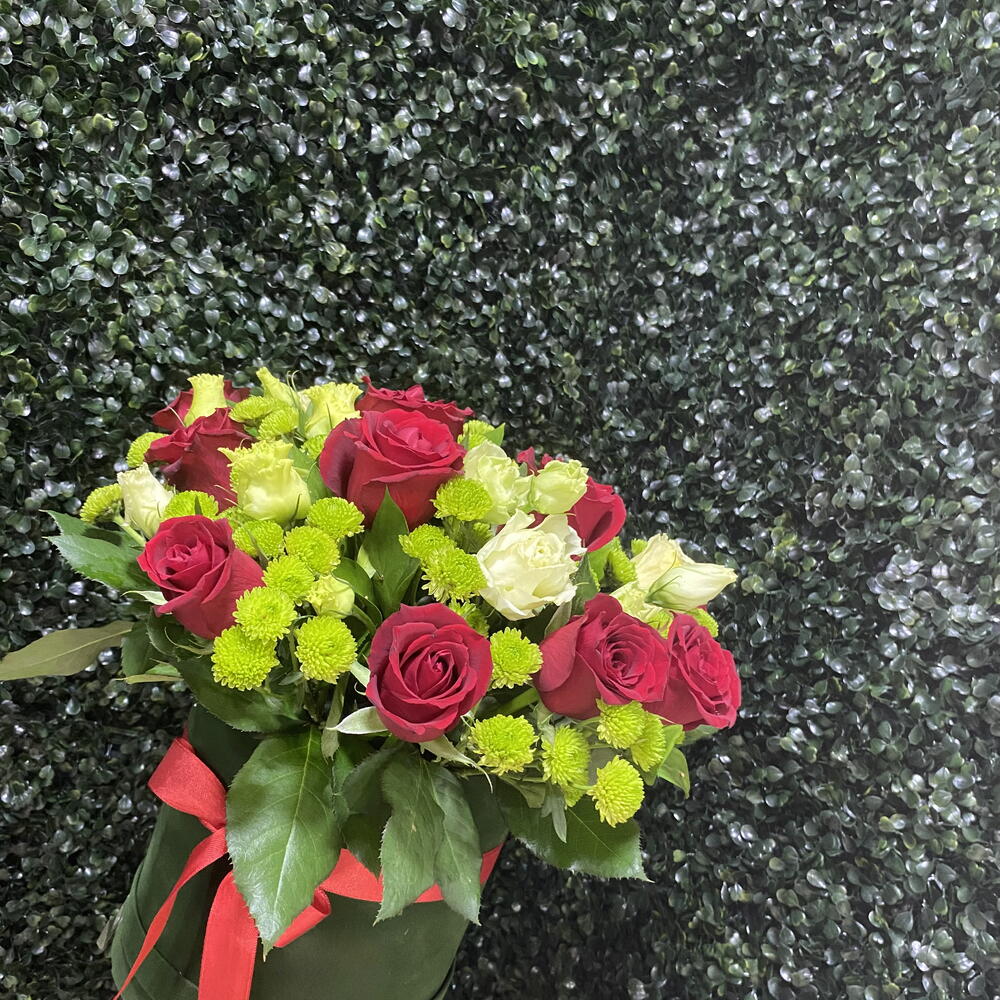 Bu muhteşem kutuda çiçekler, en ince detayına kadar düşünülmüş bir tasarıma sahiptir. İçerisinde 5 adet taze Ruskus, 13 adet zarif yeşil krizantem, 5 adet aşkın simgesi kırmızı gül ve 5 adet kutunun şıklığını tamamlayan lisiantus bulunmaktadır. Bu çiçeklerin muhteşem uyumu ve kutunun zarif dokusuyla birleşerek göz alıcı bir hediye oluşturmakta. Doğum günlerinde, yıldönümü gibi özel günlerde veya sadece sevdiklerinize küçük bir sürpriz yapmak için ideal bir seçenek. Her biri özenle seçilmiş bu çiçeklerle sevdiklerinizi şımartın!