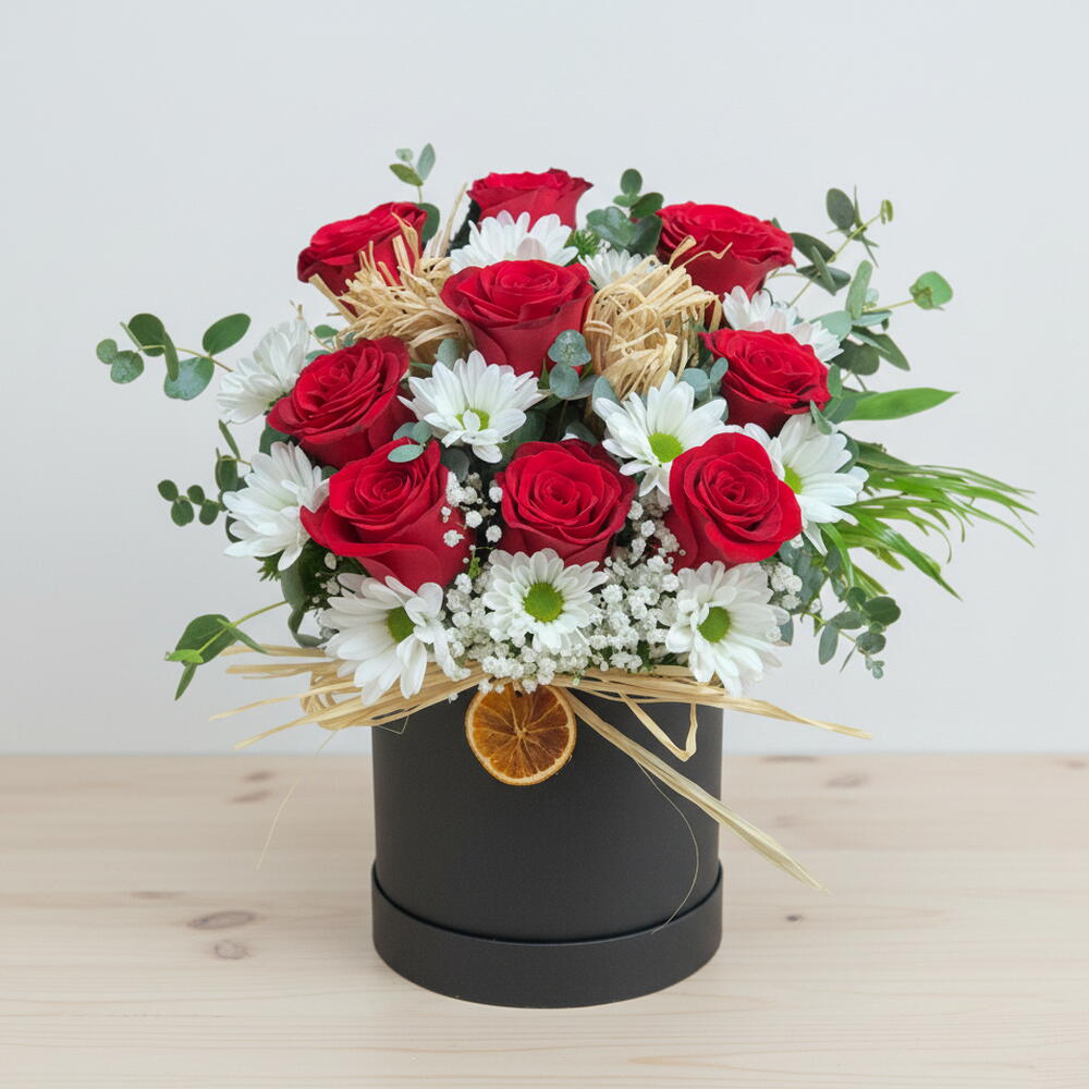 красная роза - 9 шт. эвкалипт - 5 шт. белая ромашка - 20 шт. черная коробка - 1 шт. виргетус - 3 шт.