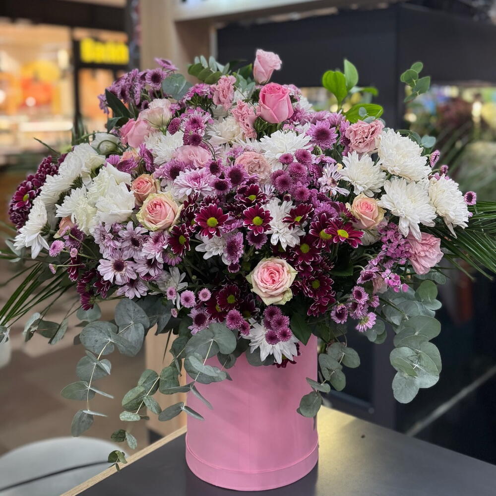 Этот большой цветочный букет в коробке, созданный в завораживающем сочетании ослепительных розовых, фиолетовых и белых тонов, сочетает в себе элегантность и стиль. В особые дни это самый эстетичный способ выразить свои чувства близким. Примечание: виды цветов могут незначительно меняться в зависимости от сезона, общая цветовая гармония сохраняется.