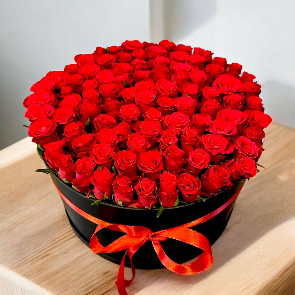 80 свежих красных роз, оформленных в чёрной роскошной коробке, — самый стильный и изящный способ выразить свои чувства. Эти розы, символ любви и страсти, созданы, чтобы сделать ваши особые дни незабываемыми. Эффектный дизайн коробки и деталь в виде красной ленты придают вашему подарку неповторимую элегантность. Это идеальный вариант подарка на День святого Валентина, годовщины или особые торжества. Эта коробка из 80 красных роз — прекрасный выбор, чтобы выразить свои чувства самым особенным образом. Рекомендации по уходу: Чтобы сохранить свежесть роз, храните коробку в прохладном и тенистом месте. Регулярно проверяйте стебли роз в водяных тубах внутри коробки и при необходимости обновляйте воду. Берегите цветы от прямых солнечных лучей и высоких температур.