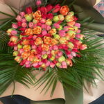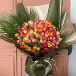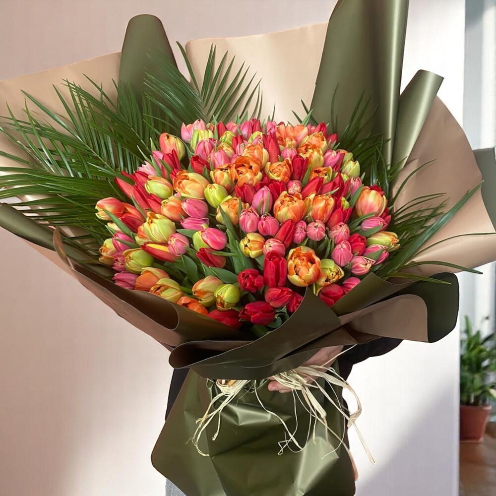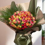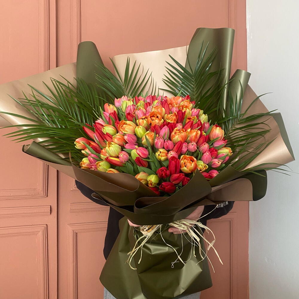 Этот великолепный букет цветов украшен 150 изящными тюльпанами и 5 зелёными пальмовыми листьями. Этот букет, в котором каждый цветок выбран и оформлен отдельно, обладает детализацией, как у произведения искусства. Палитра наполнена светлыми и яркими цветами, поэтому этот эффектный букет идеально подходит, чтобы придать живость любой комнате или мероприятию.
