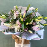 маттиола - 5 шт. букет эвкалипта - 1 шт. букет Касабланка - 1 шт. импортные лиловые розы - 10 шт.