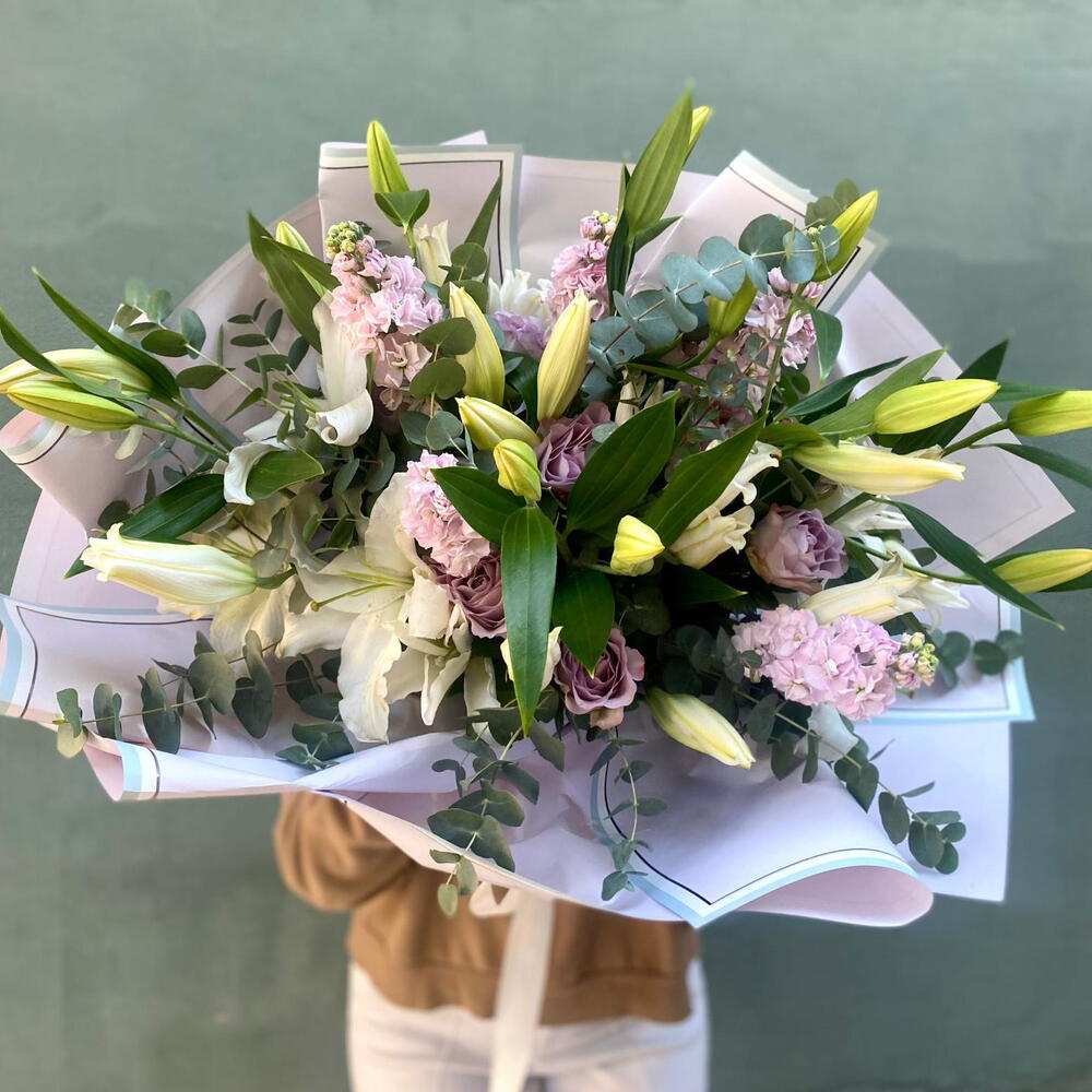 маттиола - 5 шт. букет эвкалипта - 1 шт. букет Касабланка - 1 шт. импортные лиловые розы - 10 шт.