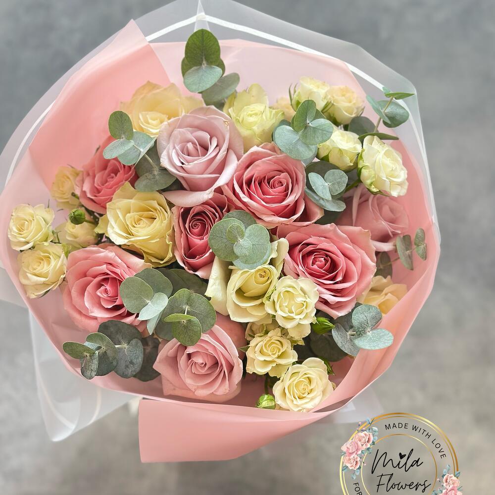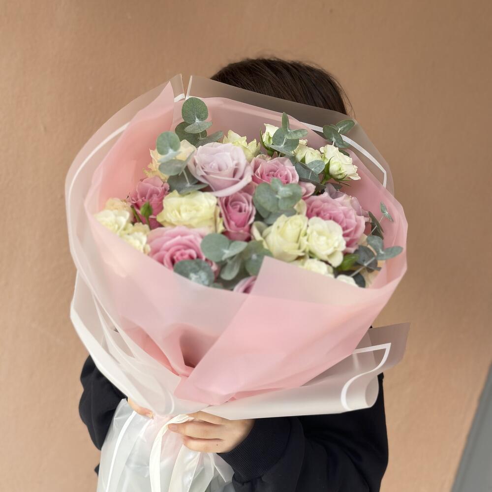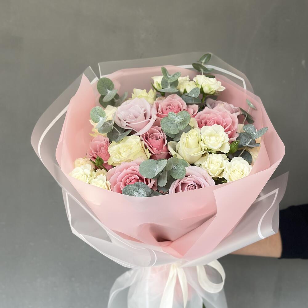 Этот особенный дизайнерский продукт сочетает в себе романтику и изящество. 8 розовых роз добавляют сладкий и женственный штрих, в то время как 5 импортных белых роз создают изысканный эффект. Также создает ароматическую атмосферу 13 белых спрей-роз и 10 веток эвкалипта. Это идеально, чтобы почувствовать себя особенным, а также в качестве внимательного подарка для ваших близких.