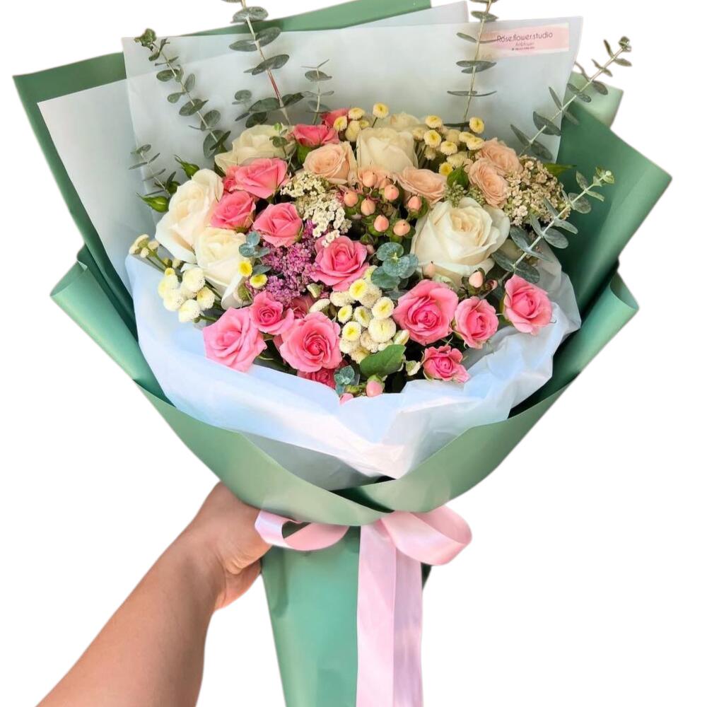 beyaz gül - 10 шт. зелень рускус - 10 шт. арка розовая роза - 10 шт. филиалы чипсо - 10 шт. хризантема ромашка - 5 шт.