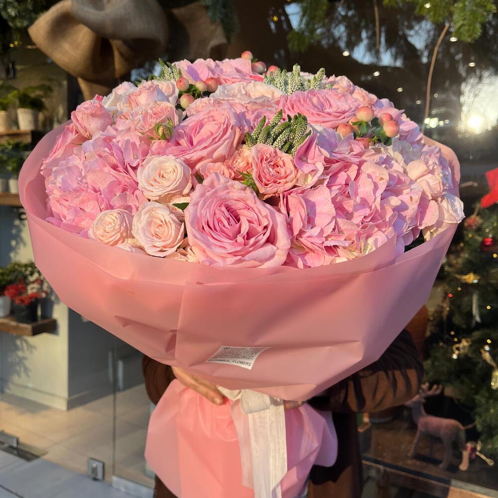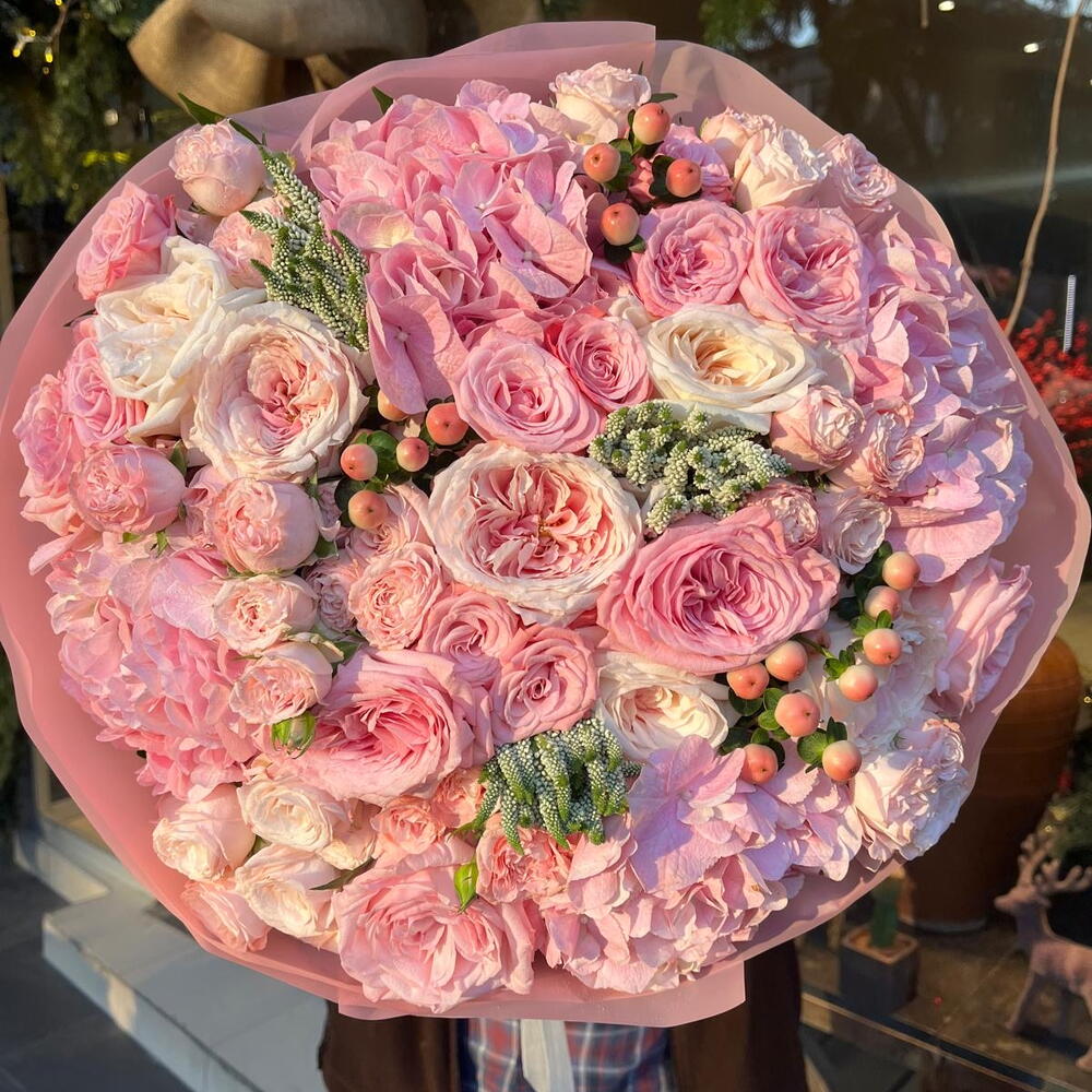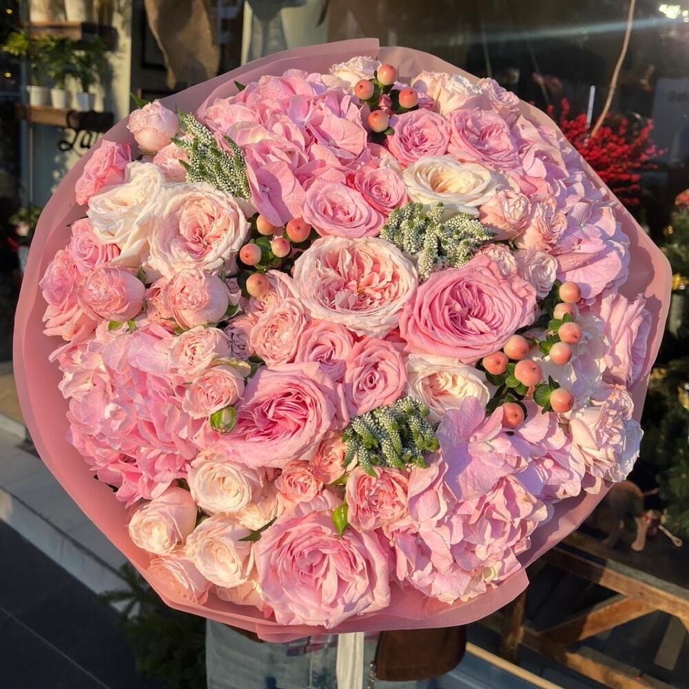 This unique authors bouquet combines the best floral traditions and modern trends. It consists of five charming lisianthus trees, eleven lush garden roses, three mysterious hypericum, nine delicate spray roses and four lush hydrangeas. All of them are complemented by a trio of mix veronicas, which add a special sophistication to the compositions. The bouquet will become an unforgettable gift for your loved ones, will surely emphasize your care and attention, and will also become a stylish decor for any interior.