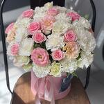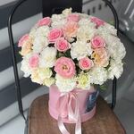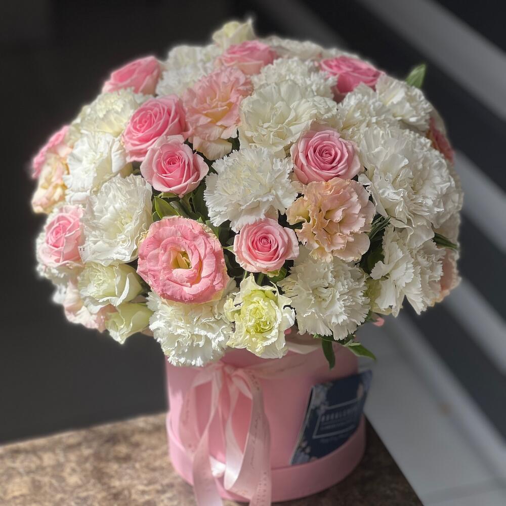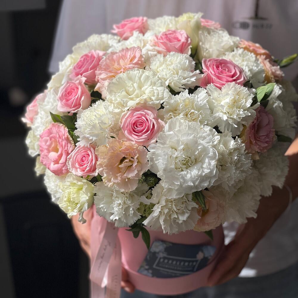 Микс из эустомы, роз и гвоздик в коробке