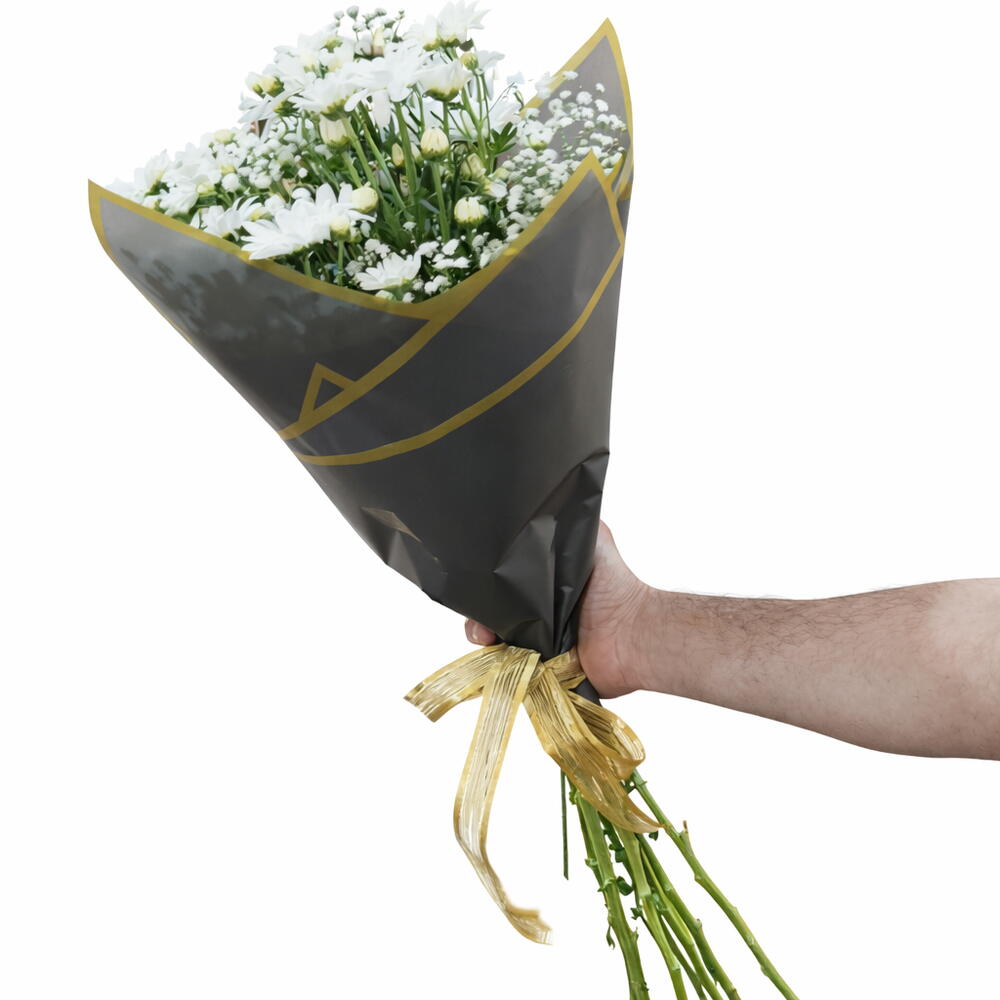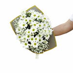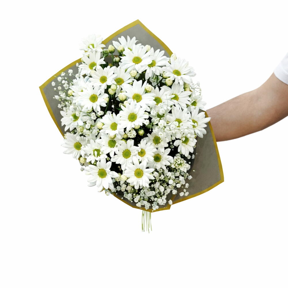 Этот прекрасный букет цветов украшен 8 нежными и изящными белыми (50-55) головками ромашек. Однако главный секрет этого букета — 6 зелёных гипсофил, придающих ему атмосферу, вдохновлённую естественностью. Этот букет цветов — идеальный выбор, чтобы покорить сердца, сделать сюрпризы и порадовать ваших любимых.
