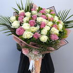 Этот элегантный смешанный букет украшен 21 белой и 20 розовыми розами, символизирующими мир и чистоту. В букет также входят четыре листа феникса и изящная гипсофила, придающая букету экзотический оттенок. Этот букет станет идеальным подарком, чтобы показать вашим любимым, насколько они особенны. Он также идеально подходит в качестве цветка для обещания или помолвки.