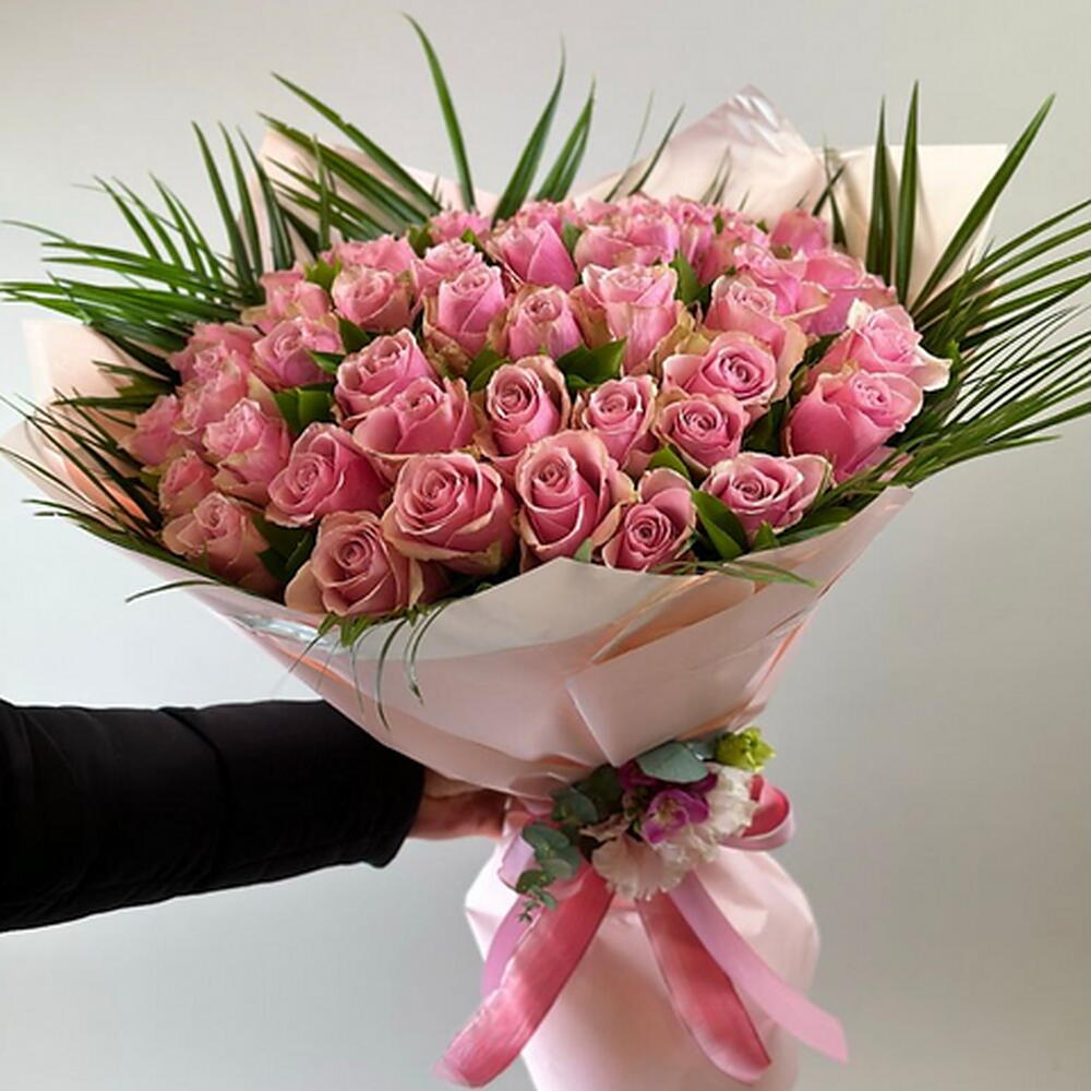 Этот элегантный цветочный букет создан из 41 потрясающей розовой розы, 4 изысканных листьев арековой пальмы и тщательно упакован. Этот великолепный букет идеально подходит для того, чтобы отметить самые особенные моменты или показать своим близким, как сильно вы их любите. Сочетая любовь и элегантность, этот особенный цветочный букет поможет вам создать воспоминания, которые вы будете хранить всегда.