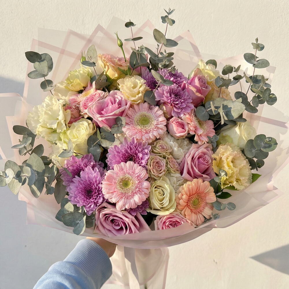 Смешанный букет в розовых тонах — это авторская цветочная композиция, отражающая изящную гармонию пастельных оттенков. Этот эффектный букет размером 50x60 см; романтическая текстура роз розовых и белых оттенков, изящная форма лизиантусов и энергичный облик мини-гербер создают притягательное единство. Побеги эвкалипта придают букету естественную свежесть и современное звучание, а хризантемы создают объём и мягкий переход. Импортные белые и розовые розы символизируют чистоту и любовь, лизиантусы — тонкость и изящество. Мини-герберы добавляют радости и живости, а спрей- и стандартные хризантемы придают букету пышность и эстетический баланс. Идеальный выбор для дня рождения, годовщины, Дня матери, поздравления с новой работой или искреннего подарка в знак благодарности.