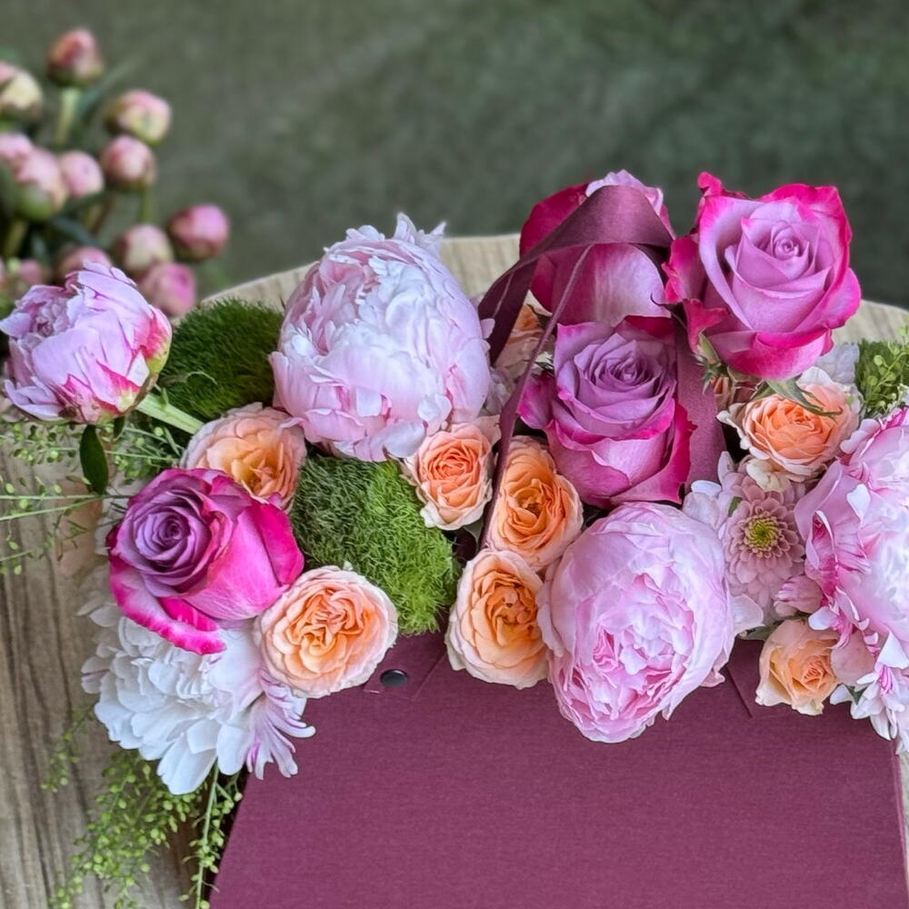 Этот очаровательный букет в коробке - идеальный выбор для выражения роскоши и элегантности. В нем содержится 6 ярко-зеленых пионов, 5 изящных роз, 7 миниатюрных спрей-роз и 6 светлых хризантем. Каждый цветок тщательно подобран и вместе они создают великолепную композицию. Эта коробка с цветами идеально подходит, чтобы показать кому-то, насколько он особенный, или добавить роскошный акцент в ваш дом.