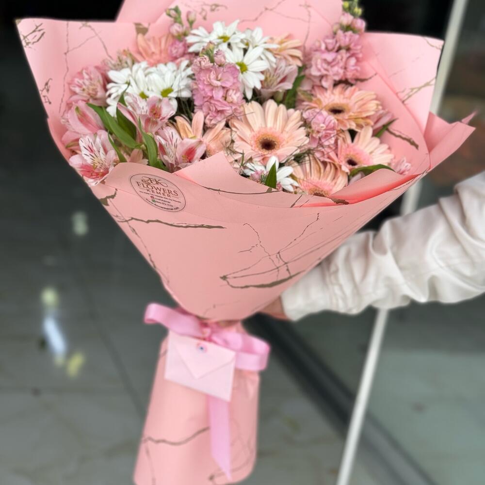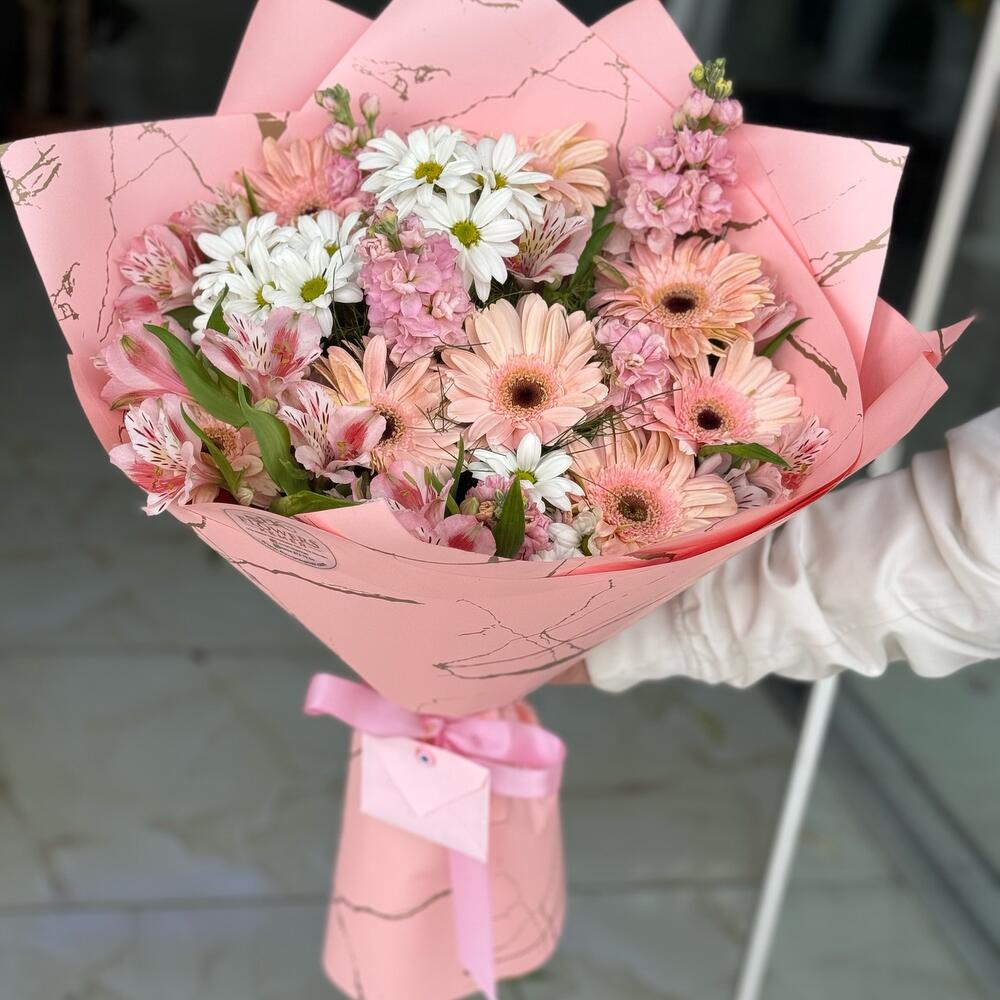 9 живых и ярких гербер, 3 свежие белые маргаритки, 5 изящных маттиол и 5 впечатляющих астомерий составляют этот Смешанный Букет, который принесет радость и счастье вашим близким во все особые дни. Идеальное сочетание цветов и свежести делает этот цветочный букет идеальным для оживления любого декора.