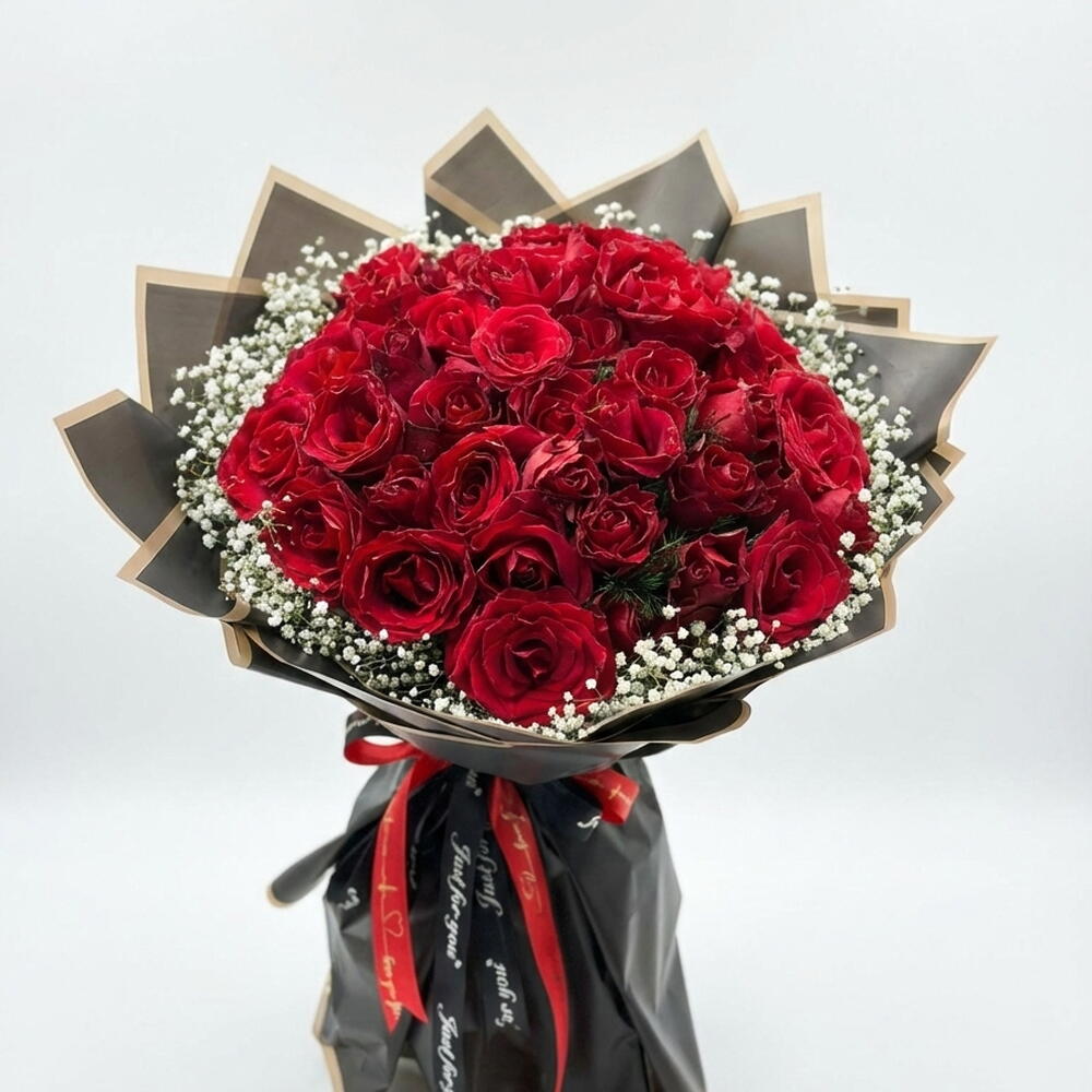 Самая чистая форма любви, страсти и изящества объединилась в этом эксклюзивном дизайнерском букете. Тщательно отобранные, свежие и эффектные красные розы в окружении белой гипсофилы («дыхание младенца») создают безупречный контраст и придают букету ослепительный вид. Премиальная матовая чёрная упаковка с золотистыми деталями, придающая изделию благородный характер, и элегантная лента с надписью «Только для тебя (Только для тебя)» делают этот букет далеко не обычным подарком — он дарит роскошный опыт.