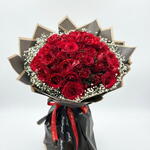 Премиальная черная упаковка, букет из 41 красной розы, созданный по индивидуальному заказу.