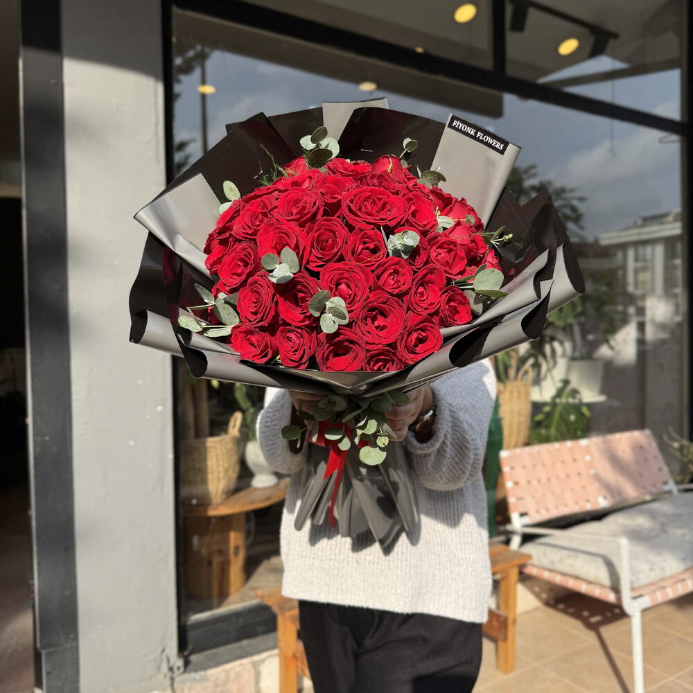 красные розы - 41 шт. лист евкалипта - 10 шт.