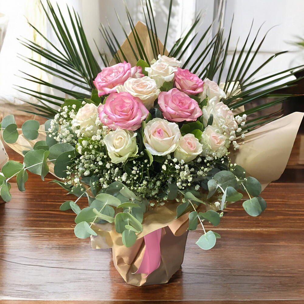 Этот уникальный букет, созданный из изящного сочетания розовых и белых роз, приносит вашим близким чистую красоту природы! Нежность роз, свежесть листьев эвкалипта и чарующие детали гипсофилы в этой композиции сочетают элегантность и простоту. Букет, представленный в специальной крафт-упаковке, является идеальным подарком для любых особых случаев и праздников. Прекрасный выбор для романтической годовщины, искренней благодарности или сюрприза, полного любви. Сделать близких счастливыми с помощью аромата свежих цветов и их натуральной фактуры теперь очень просто. Закажите прямо сейчас, чтобы изящно выразить свои чувства!