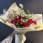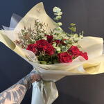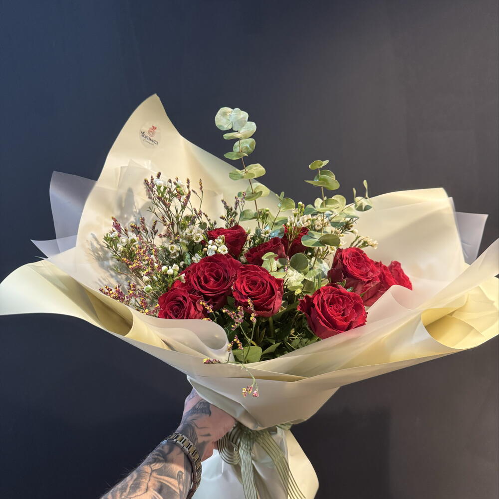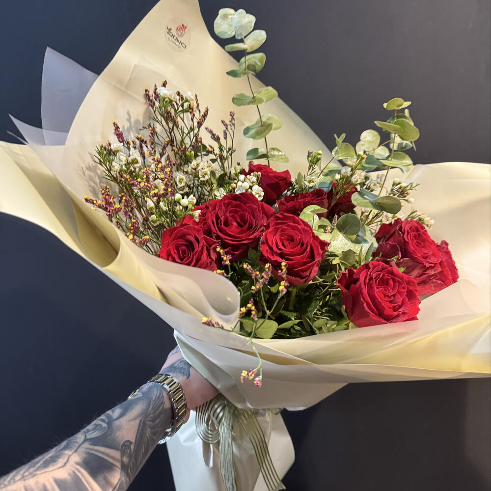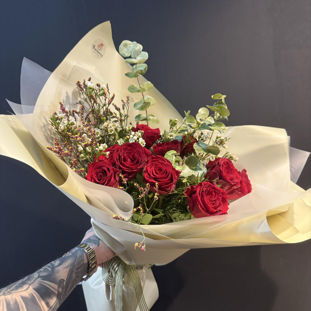 Самый элегантный способ выразить любовь в ее чистейшей форме… Этот особенный букет, составленный из тщательно отобранных свежих красных роз и натуральной зелени, подарит незабываемый сюрприз вашим любимым. 💐 Детали продукта: • Свежие красные розы (премиум качества) • Эвкалипт и натуральная зелень • Цветы-наполнители (гипсофила / воск) • Букет в специальной бумаге • Элегантная лента 🎁 Основные характеристики: • Особый дизайн ручной работы • Гарантированно свежие и яркие цветы • Быстрая доставка в тот же день • Возможность добавить персонализированную записку
