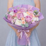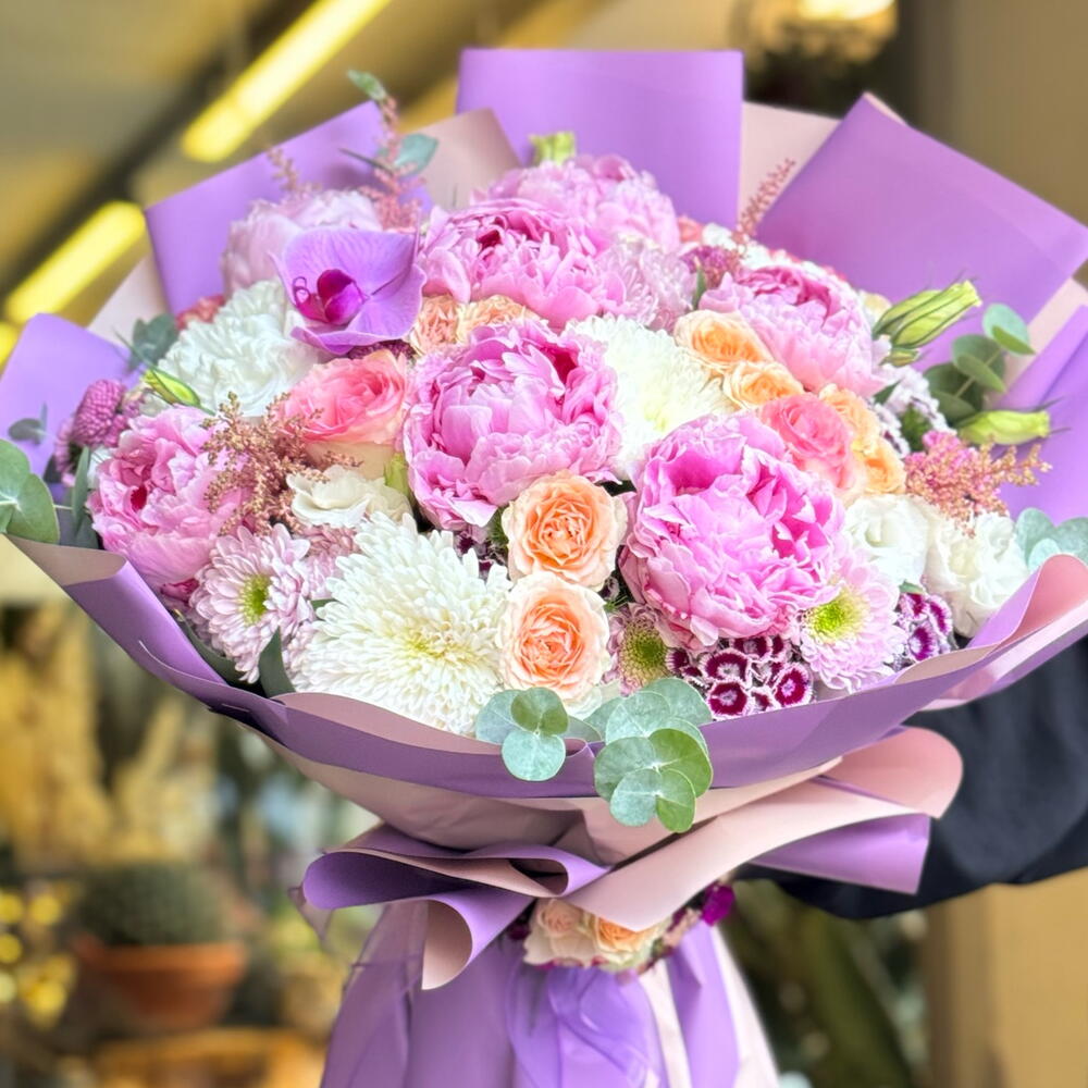 Этот особенный букет, составленный в элегантной гармонии пастельных тонов, станет романтичным и стильным подарком. Пышная текстура розовых пионов уравновешивается простотой белых хризантем и теплотой лососево-розовых роз. Современный вид достигается благодаря фиолетовой упаковке и соответствующей ленте. Состав букета: • Розовые пионы (6 шт.) • Лососево-розовые розы (8-10 стеблей) • Белые хризантемы (3-4 стебля) • Миниатюрные гвоздики или похожие цветы-наполнители • Эвкалипт и сезонная зелень Упаковка: Специальная бумага для букета в фиолетовых и пастельных тонах, перевязанная соответствующей лентой.