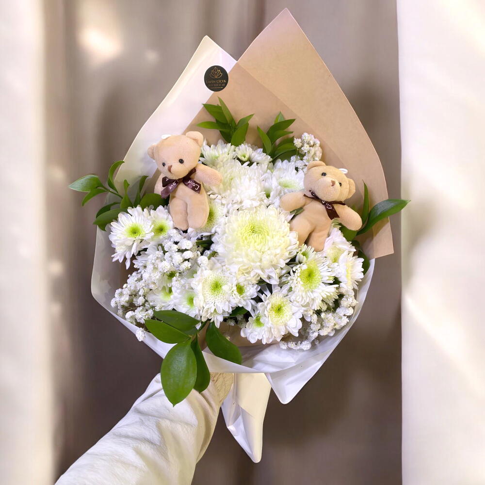 Букет Sevgi Ayıcıkları сочетает в себе чистоту и красоту белых хризантем с милыми плюшевыми мишками, создавая сказочный дизайн. Большая белая хризантема в центре букета выделяется как символ свежести и изящества. Зеленые детали и гипсофила дополняют умиротворяющую текстуру природы. Плюшевые мишки превращают этот букет не просто в цветочную композицию, но и в наполненный любовью подарок. Идеальный выбор для празднования рождения малыша, романтического сюрприза или особого момента. Этот букет, в каждом своём элементе несущий невинность и счастье, — прекрасен, чтобы заставить ваших близких улыбнуться.