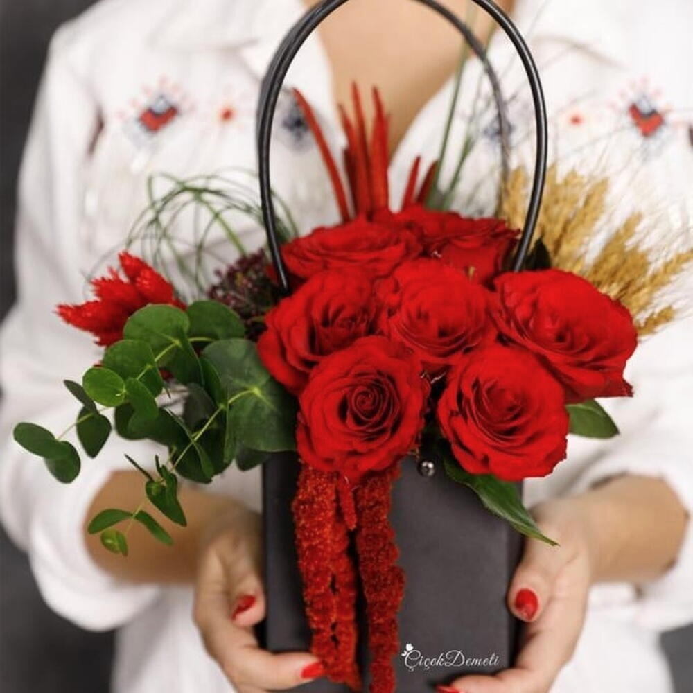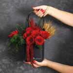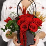 Эта стильная композиция из красных роз, символа страсти и элегантности, с современным дизайном коробки представляет собой эффектный вариант подарка. Розы с бархатистой текстурой ярко выражают сильные чувства и глубокую любовь. Листья эвкалипта и натуральные акценты из колосьев придают композиции утончённый и естественный баланс. Свисающие декоративные амарантовые детали придают композиции динамику и оригинальный характер. Благодаря минималистичной чёрной коробке композиция выглядит одновременно роскошно и современно, привлекая внимание в любой обстановке. Идеальный выбор для Дня святого Валентина, годовщин, романтических сюрпризов, особых праздников и значимых жестов извинения. Чтобы сохранить свежесть цветов, рекомендуется поддерживать губку слегка влажной, размещать композицию вдали от прямых солнечных лучей и защищать от чрезмерно жарких условий.