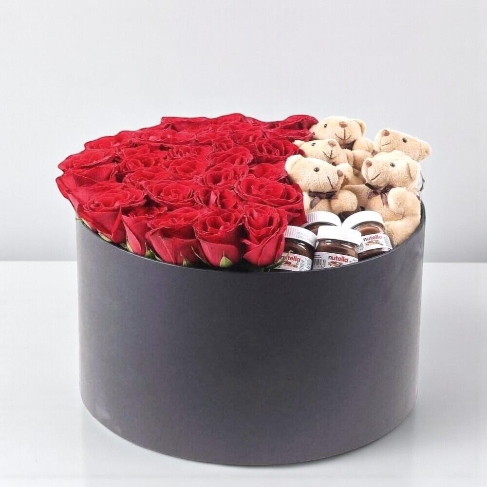 Черная коробка с 30 красными розами, мишкой и Nutella Этот особенный дизайнерский букет включает в себя 30 красных роз в роскошной черной коробке, милого медвежонка и сладкую Nutella. Красные розы, являющиеся изысканным выражением романтики и любви, в сочетании с элегантностью черной коробки создают впечатляющий вид. Символ Романтики и Любви Красные розы известны как символ любви и страсти. Они помогают вам выразить свои чувства самым красивым образом. Современный и элегантный дизайн черной коробки подчеркивает красоту роз и придает изысканный вид. Милый Медвежонок для Теплого Прикосновения Милый медвежонок, идущий в комплекте с вашим заказом, согреет сердце получателя подарка. Медвежонок передает любящее и теплое послание, делая этот момент еще более особенным. Сладкая Nutella для Счастья Nutella добавляет сладкое прикосновение к вашему заказу. Этот вкусный сюрприз вызовет улыбку на лице вашего любимого человека, усиливая эффект от букета. Эта сладкая и романтическая комбинация создает незабываемые воспоминания. Идеально для Особых Моментов Черная коробка с 30 красными розами, мишкой и Nutella - идеальный выбор для дней рождения, годовщин и особых праздников. Этот стильный и значимый подарок порадует вашего любимого человека и передаст ваши чувства самым впечатляющим образом.