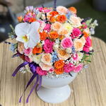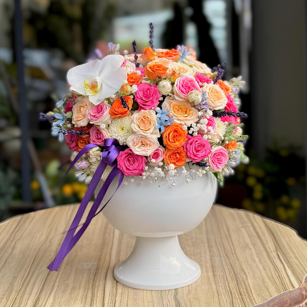 Этот изящный цветочный ящик переносит вас в мир всех цветов природы. В нем находятся 15 цветных спрей-роз, одна блестящая орхидея в кандиле, 5 штук нежной гипсофилы и 7 ярких хризантем. Все цветы аккуратно размещены в белом керамическом горшке. Этот цветочный ящик может украсить ваш дом или офис, или стать прекрасным подарком для ваших близких.