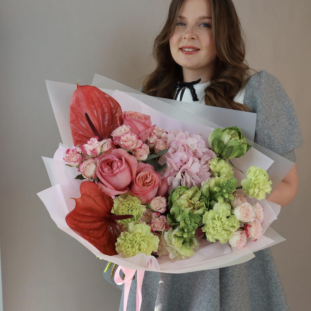 Snapdragon - 2 шт. Spray rose - 6 шт. Hydrangea - 1 шт. dianthus - 5 шт. anturium - 2 шт. pink expression - 3 шт. veggie rose - 2 шт.