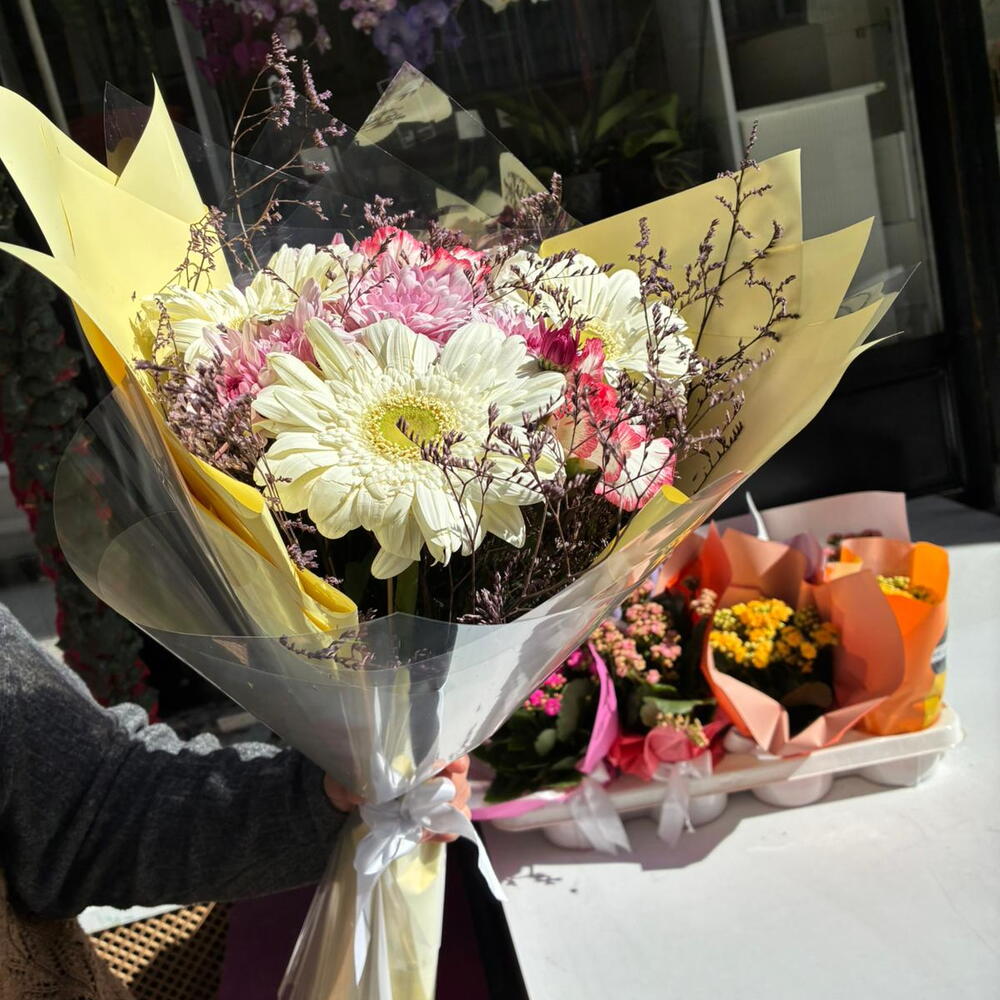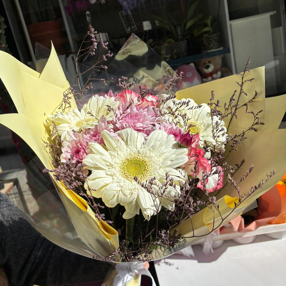 Изысканный дизайн, вдохновлённый тёплыми тонами солнца… 💛 Этот особый букет, выполненный с невинностью белых гербер, романтическим штрихом розовых хризантем и деталями из натуральных сухоцветов, предлагает одновременно энергичный и изысканный образ. Жёлтая упаковка создаёт позитивный и привлекающий внимание эффект. Идеальный выбор для дня рождения, благодарности, пожеланий скорейшего выздоровления или неожиданного приятного сюрприза от души. 🌼 Яркие белые герберы 🌸 Детали из розовых хризантем 🌿 Натуральное наполнение и аксессуары из сухоцветов 🎀 Стильная упаковка и изящное оформление Своим сиянием и энергией он наполняет любую обстановку радостью ✨ Изысканный дизайн, вдохновлённый тёплыми тонами солнца… 💛 Этот особый букет, созданный с невинностью белых гербер, романтическим штрихом розовых хризантем и деталями из натуральных сухоцветов, предлагает одновременно энергичный и изысканный образ. Жёлтая упаковка создаёт позитивный и бросающийся в глаза эффект. Идеальный выбор для дня рождения, благодарности, пожеланий скорейшего выздоровления или любого сюрприза от души. 🌼 Яркие белые герберы 🌸 Детали из розовых хризантем 🌿 Натуральное наполнение и аксессуары из сухоцветов 🎀 Стильная упаковка и элегантная завязка Его блеск и энергия приносят радость в любую обстановку ✨