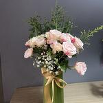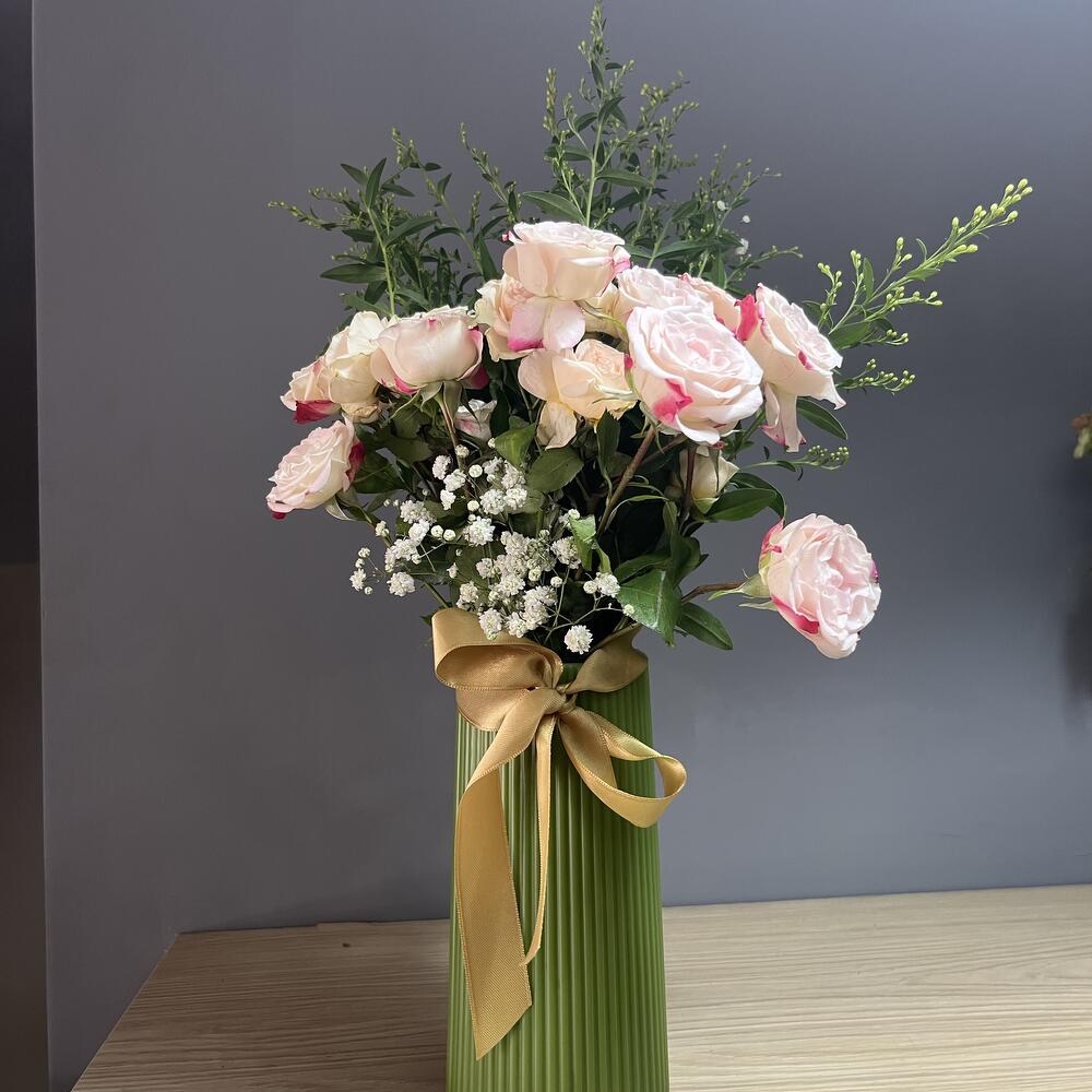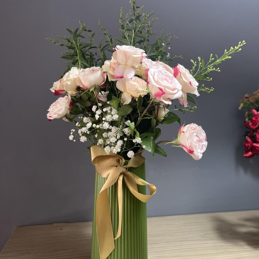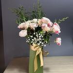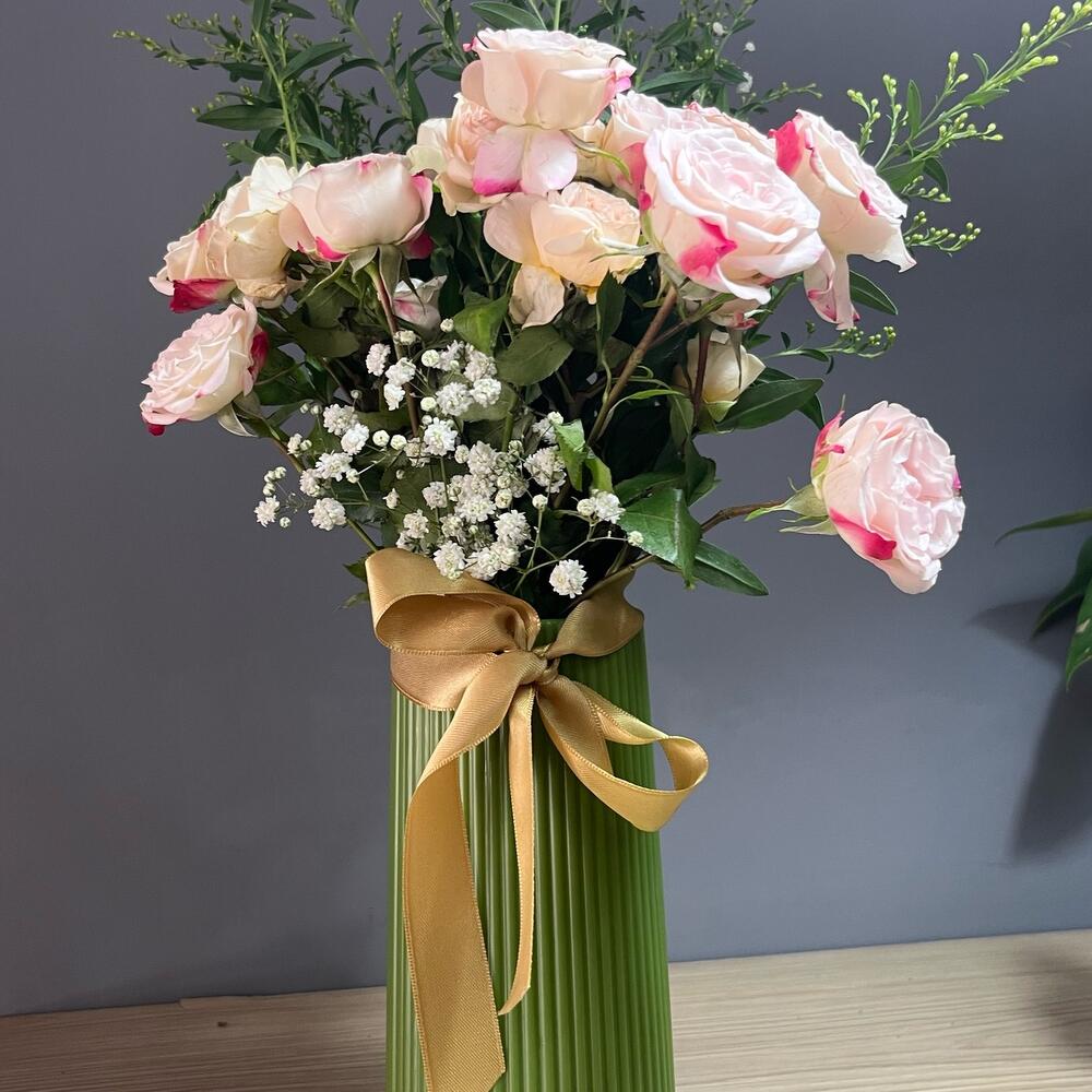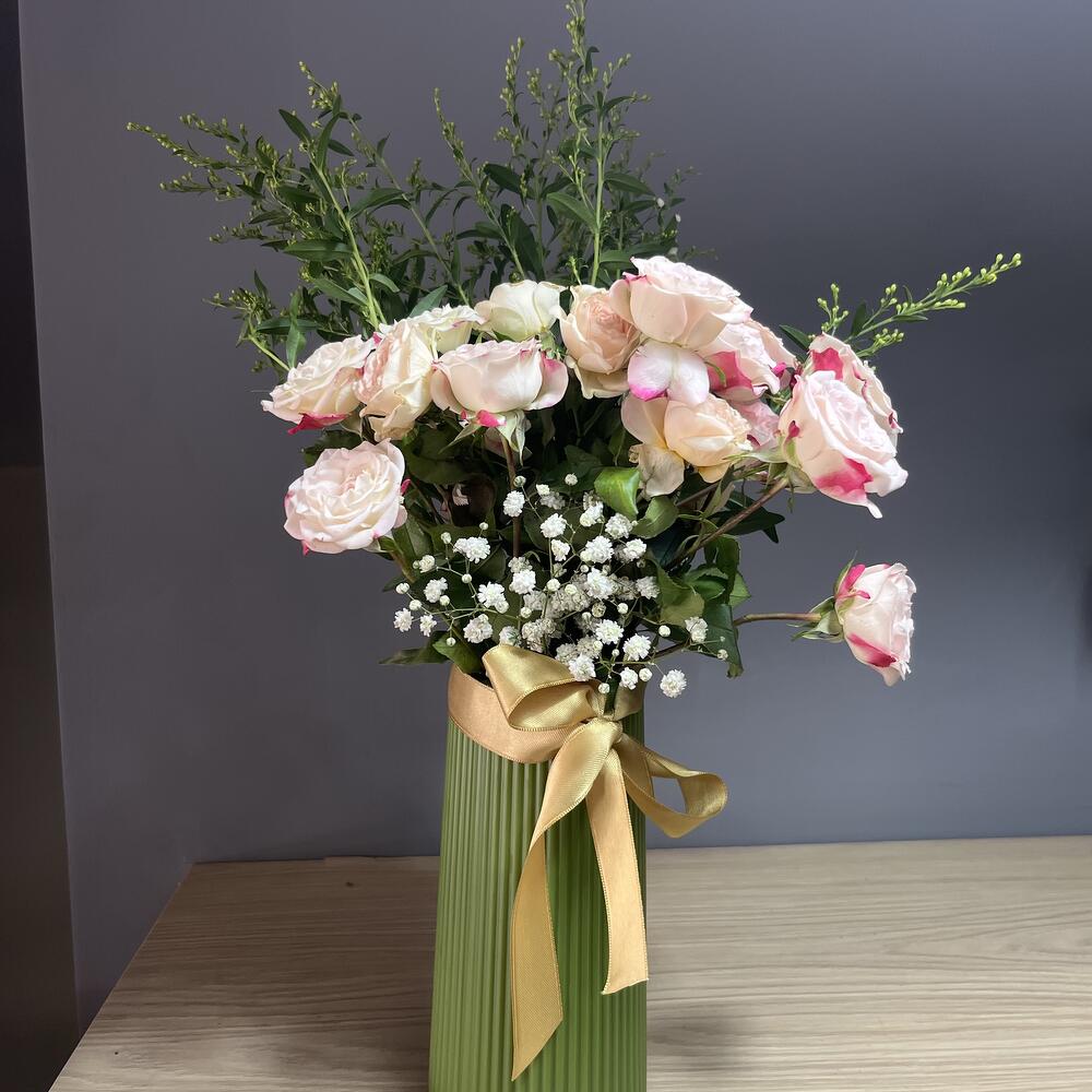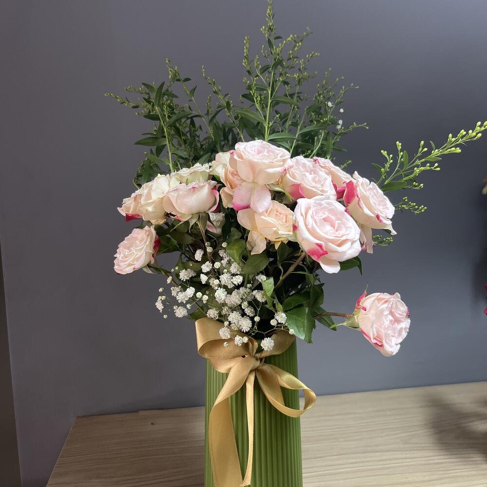 банты - 1 шт. Извините, но вы предоставили слишком мало контекста или текста, чтобы я мог определить язык или выполнить перевод. Пожалуйста, предоставьте более полный текст. - 2 шт. розовая беседка из роз - 10 шт. ваза - 1 шт. белый ципсо - 20 шт.