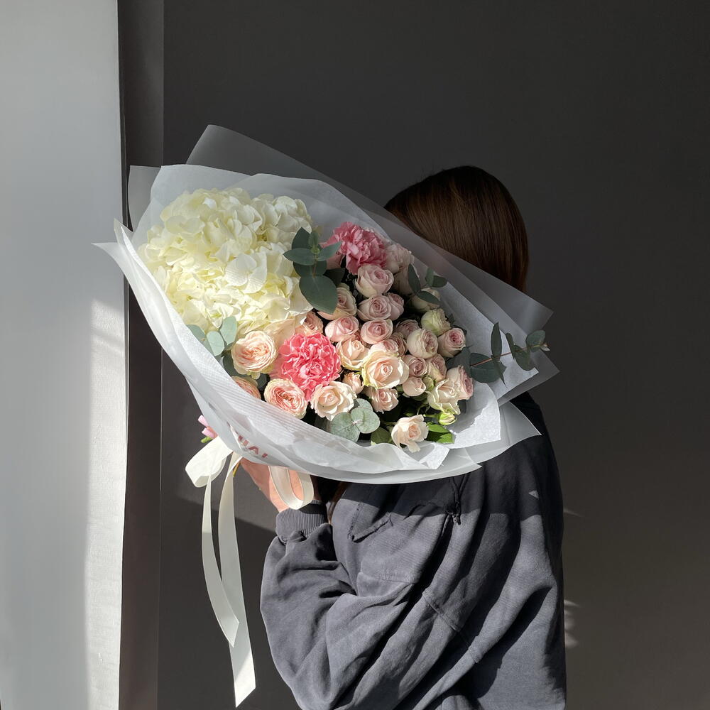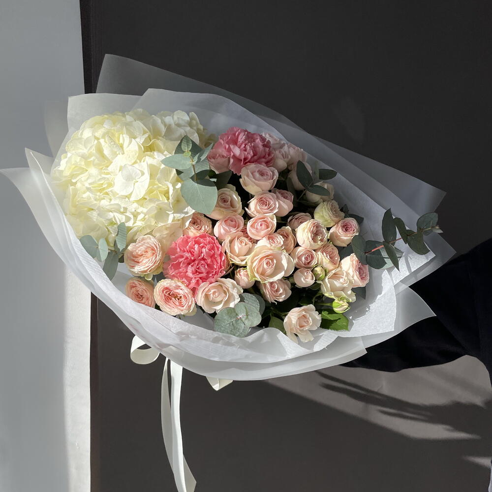 Box - 1 шт. dianthus - 2 шт. çalı gülü - 6 шт. ortanca - 1 шт. okaliptüs karışımı - 1 шт.