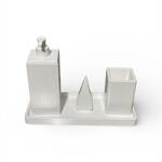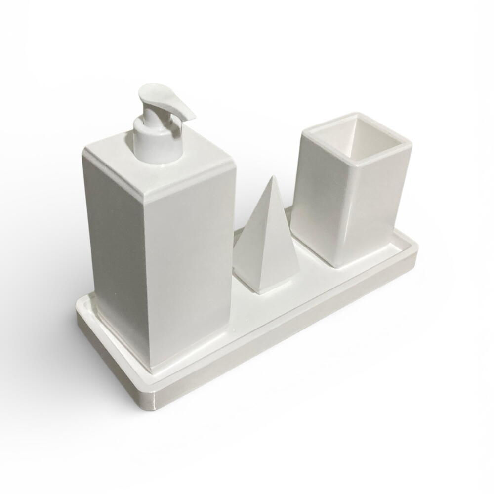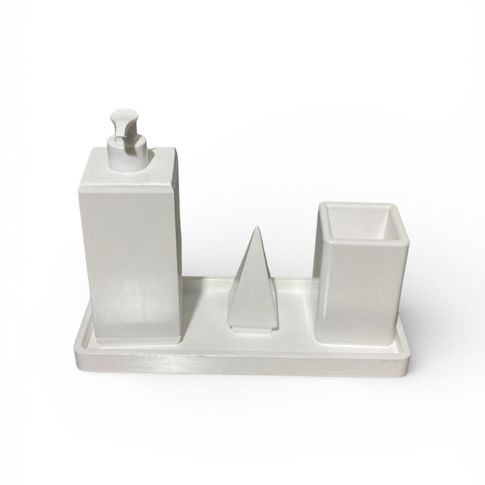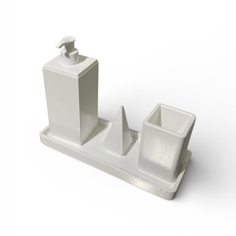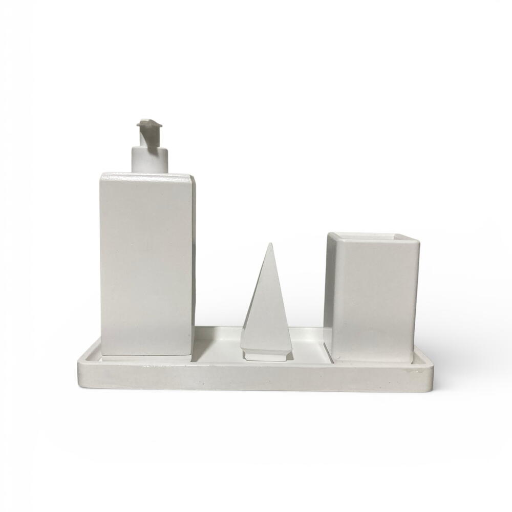 Набор из 4 предметов для ванной комнаты, имитирующий текстуру камня (белый) Если вы ищете прочный и эстетически привлекательный набор для преображения вашей ванной комнаты, вы попали по адресу. Мы объединили естественную текстуру камня с защитным лаком, обеспечивающим длительное использование. Состав набора: • 1 дозатор жидкого мыла: со стильным белым насосом. • 1 подставка для зубных щеток: вместительная и эстетически привлекательная. • 1 декоративная пирамидка: используйте ее как подставку для колец или как декоративный элемент. • 1 поднос: подставка для хранения, которая удерживает все предметы вместе.