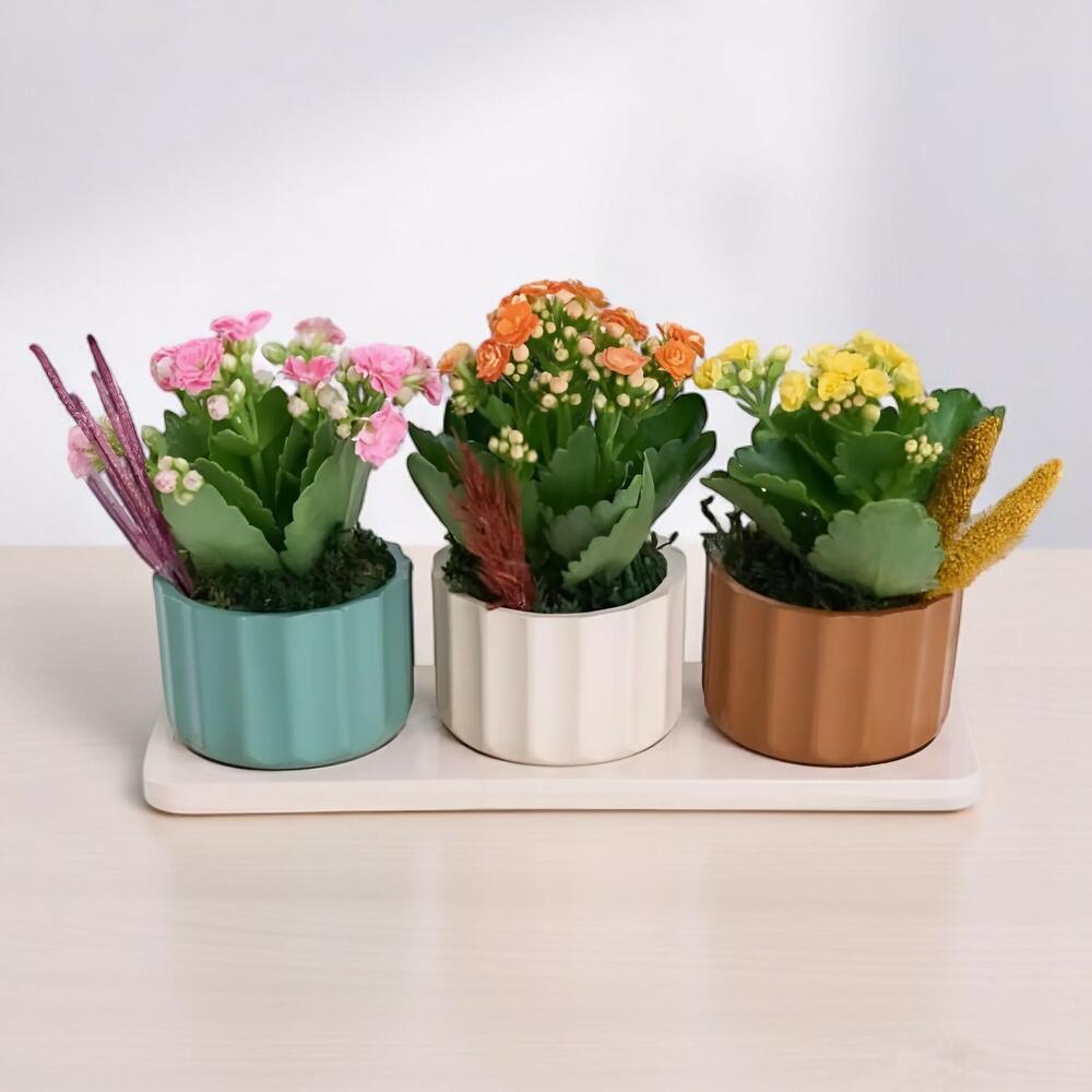 Набор из трёх каланхоэ в горшках, ослепляющий своими яркими цветами, — идеальный выбор, чтобы добавить элегантности и природности в интерьер дома или офиса. Каланхоэ, тщательно отобранные в трёх разных цветах (жёлтый, розовый и оранжевый), размещены в декоративных горшках на эстетичном подносе. Благодаря прочной конструкции и низким требованиям к уходу он подходит как любителям природы, так и людям с плотным ритмом жизни.