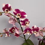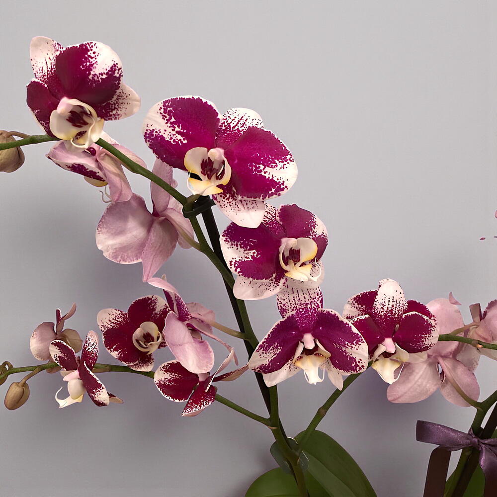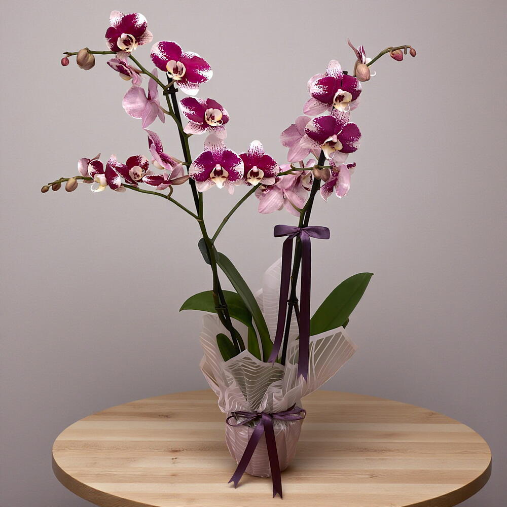 Фиолетовая пятнистая орхидея с двумя стеблями в фиолетовом керамическом горшке