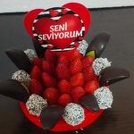 çilek - 20 adet bitter çikolata kaplı elma - 8 adet hindistan cevizi ve çikolata kaplı truf - 8 adet